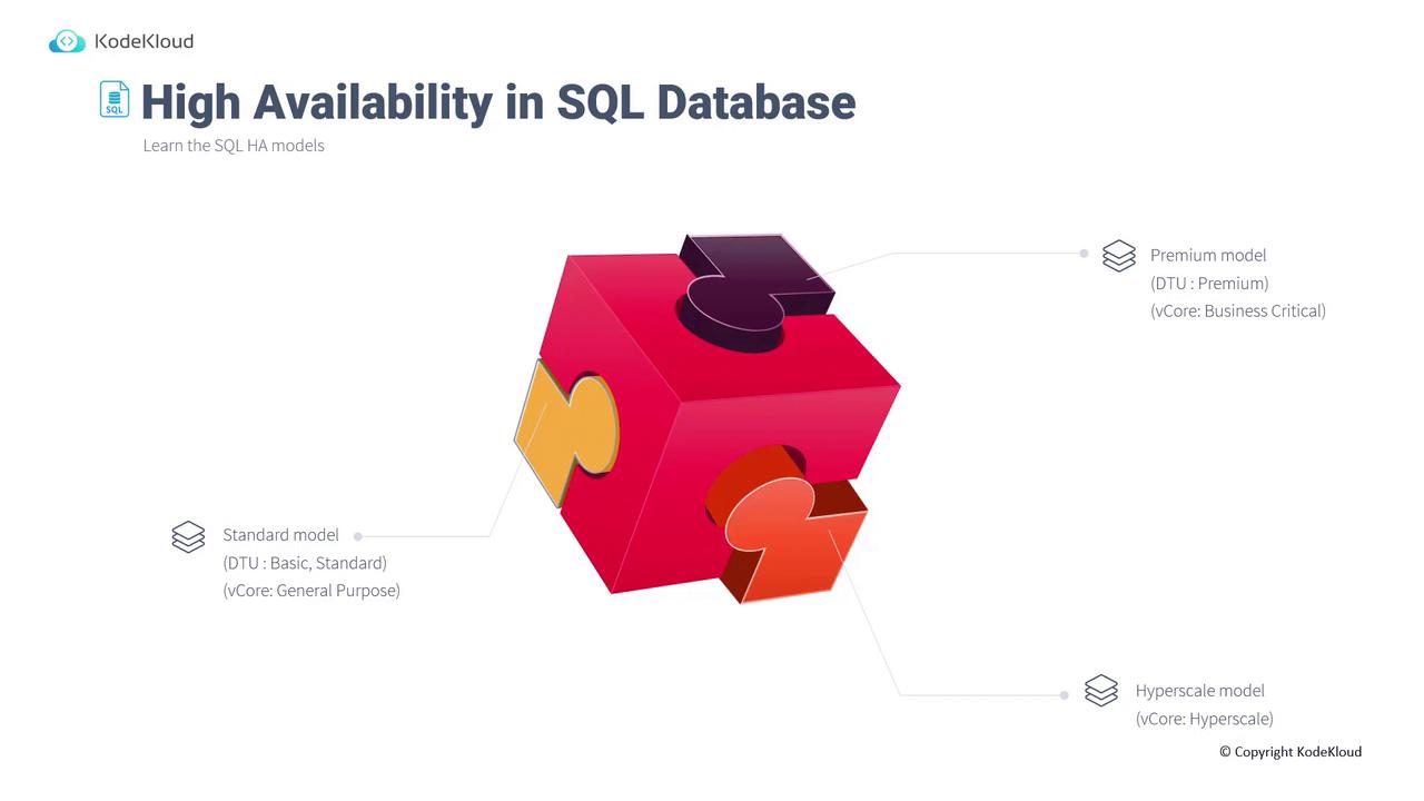 To summarize, SQL Database availability can be achieved through different architectural models tailored for specific business needs: