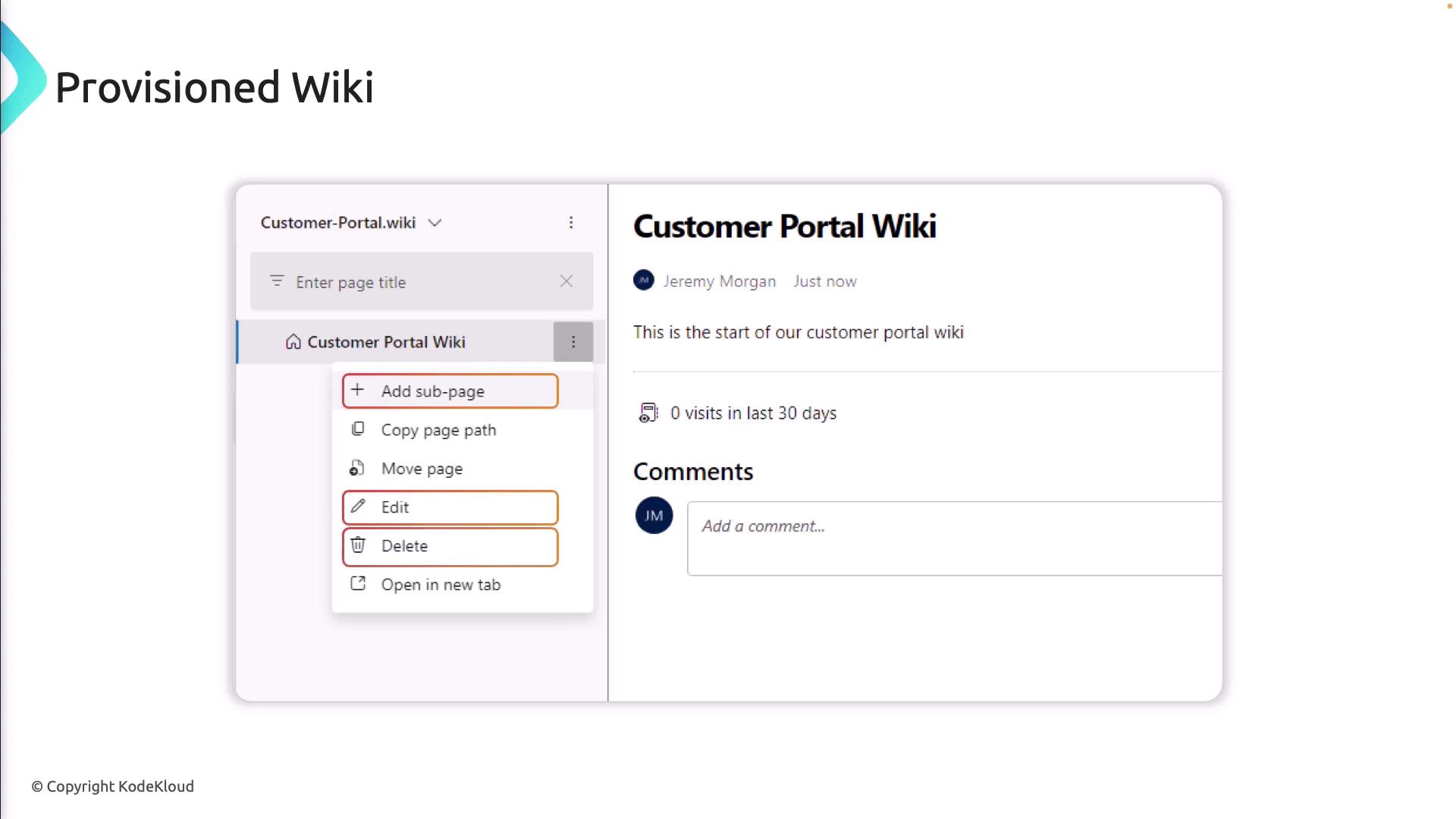Editing content directly in the provisioned wiki editor won’t update your Git repository. For changes, commit to your repo branch.