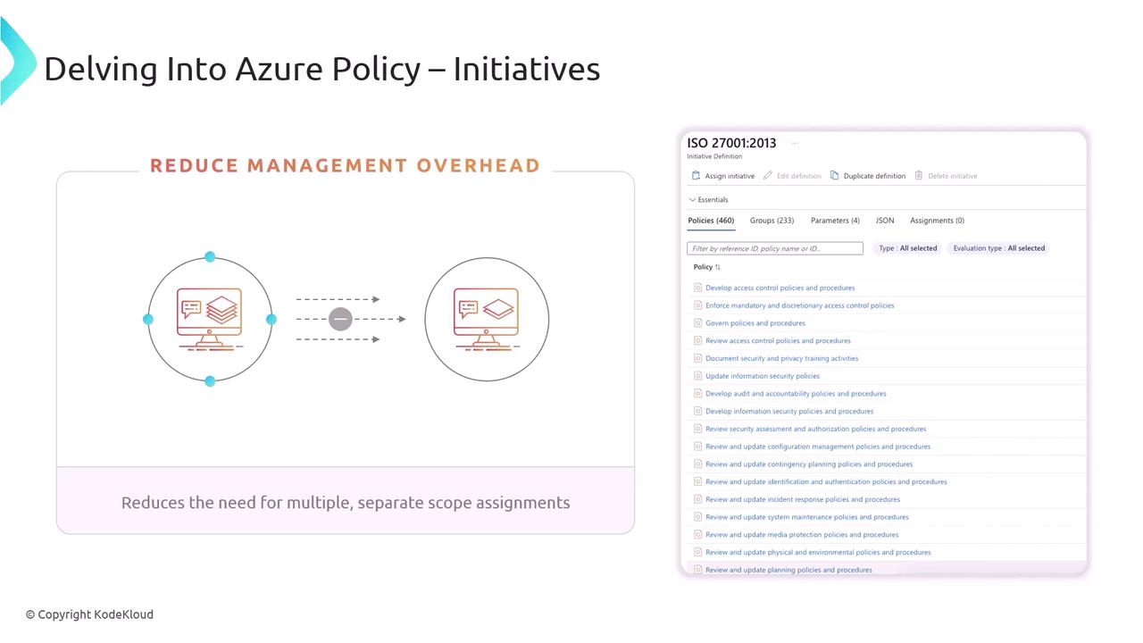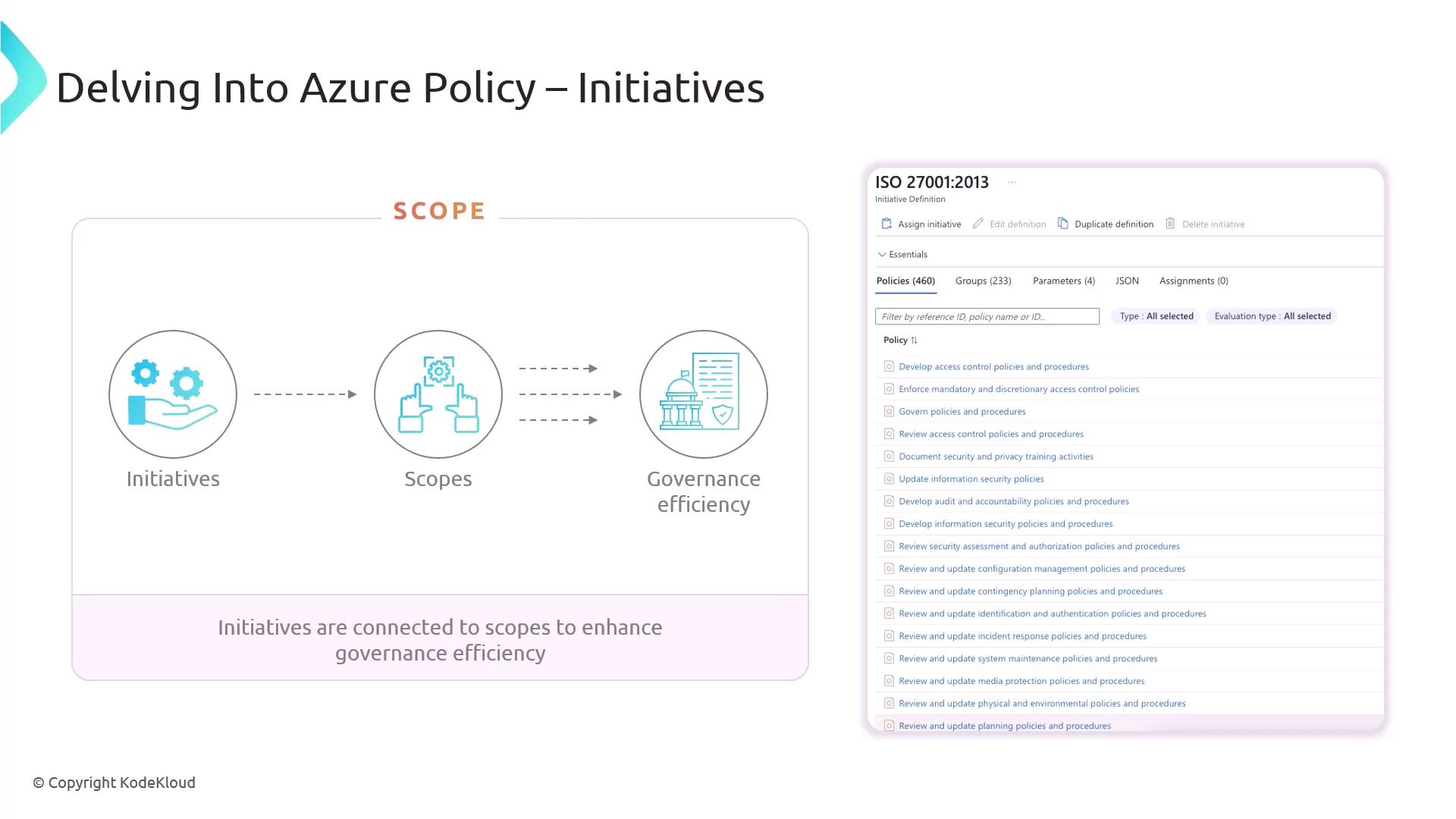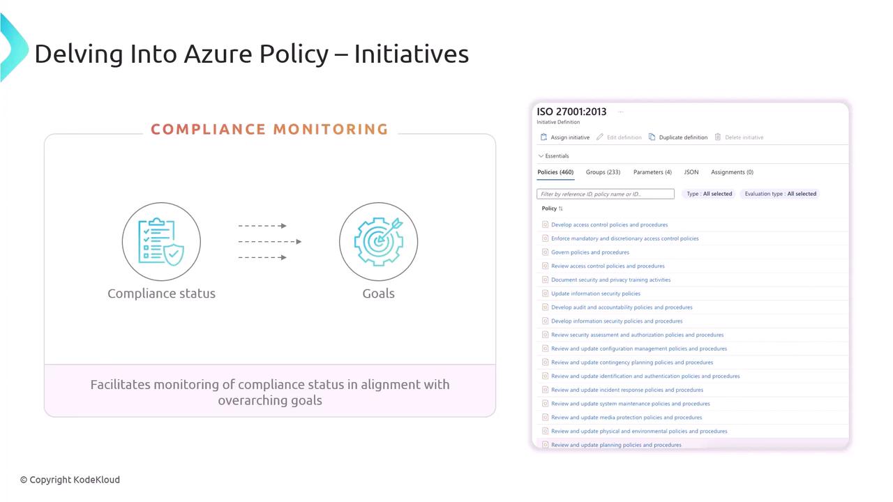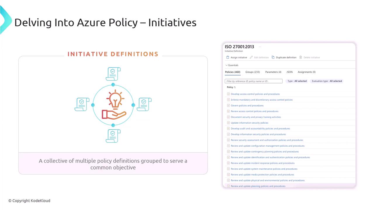 An initiative (also called a policy set) bundles multiple policy definitions to achieve a broader compliance objective—such as ISO 27001:2013 or PCI DSS. Initiatives simplify management by grouping related policies and tracking their combined compliance status.