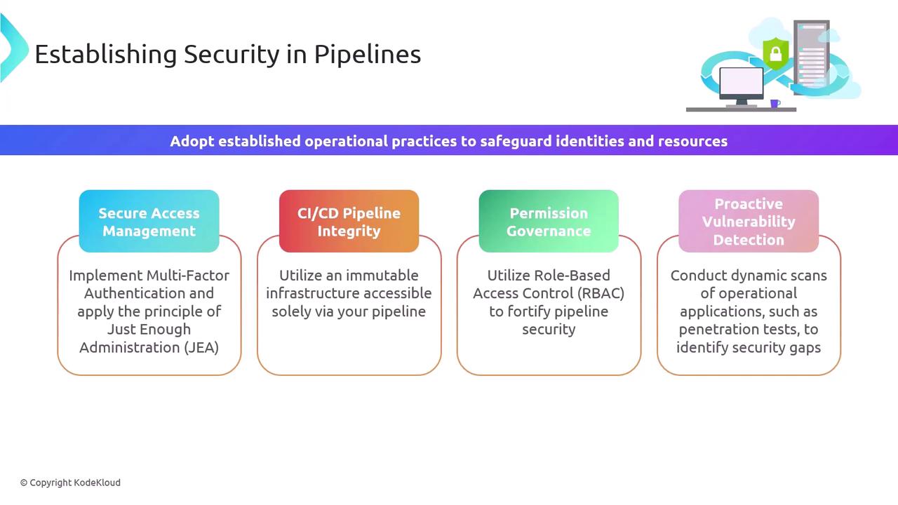 | Secure Access Management | Ensure only authenticated and authorized users can interact with your pipeline | Implement Multi-Factor Authentication (MFA) and Just-Enough Administration |