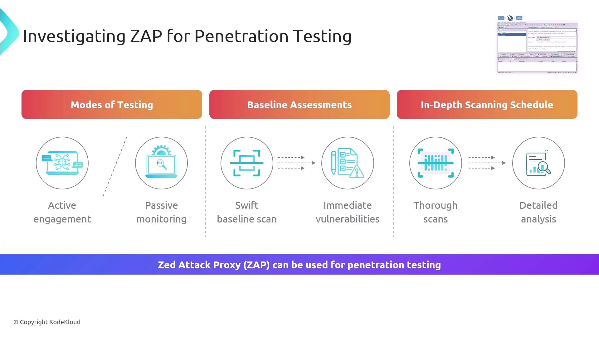 | Active Scanning | Injects payloads and probes responses to detect vulnerabilities automatically | Pre-release security testing |