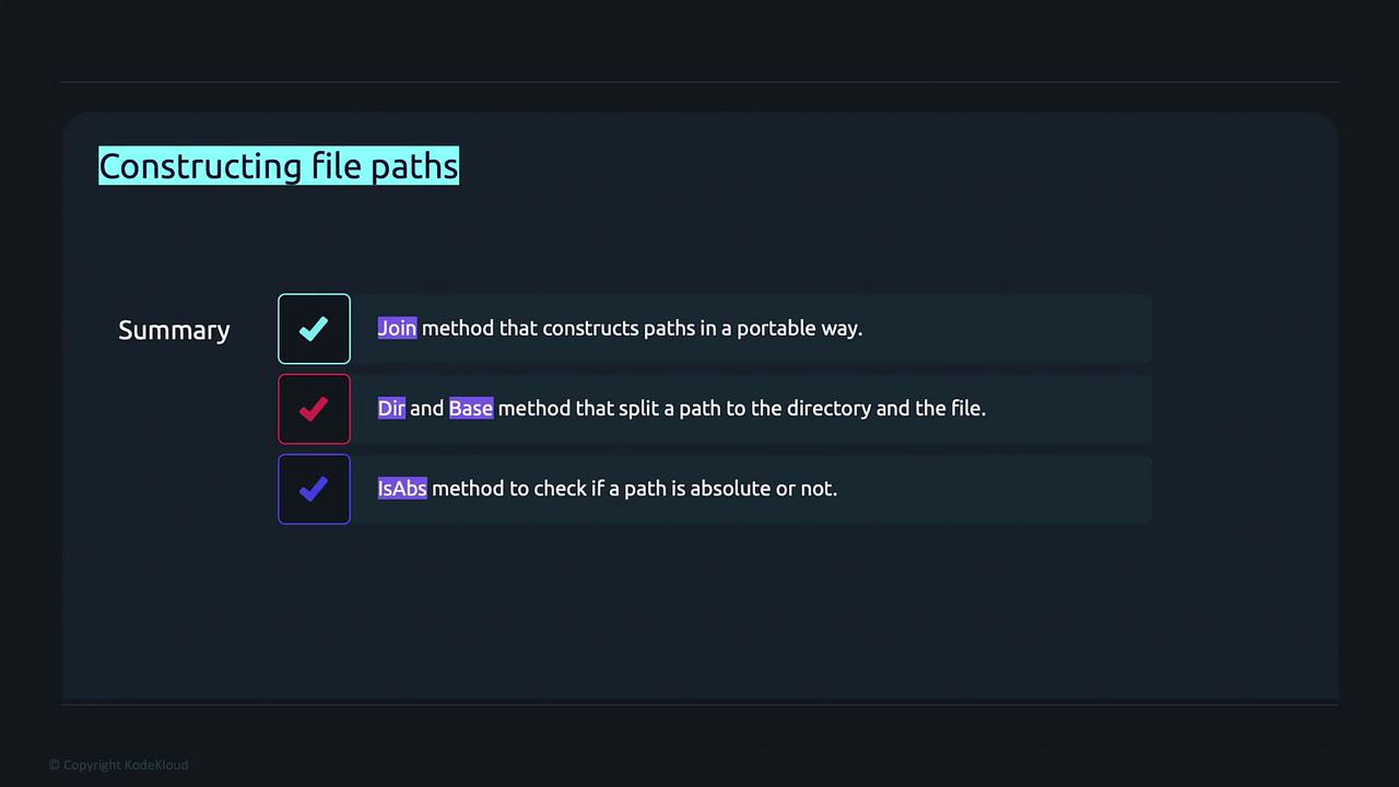 The filepath package offers methods to build and manipulate file paths portably across operating systems. Key methods include: