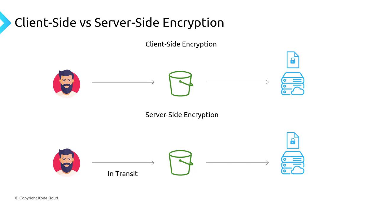 - Server-Side Encryption: You send plaintext over HTTPS; AWS encrypts it at rest using the method you choose.