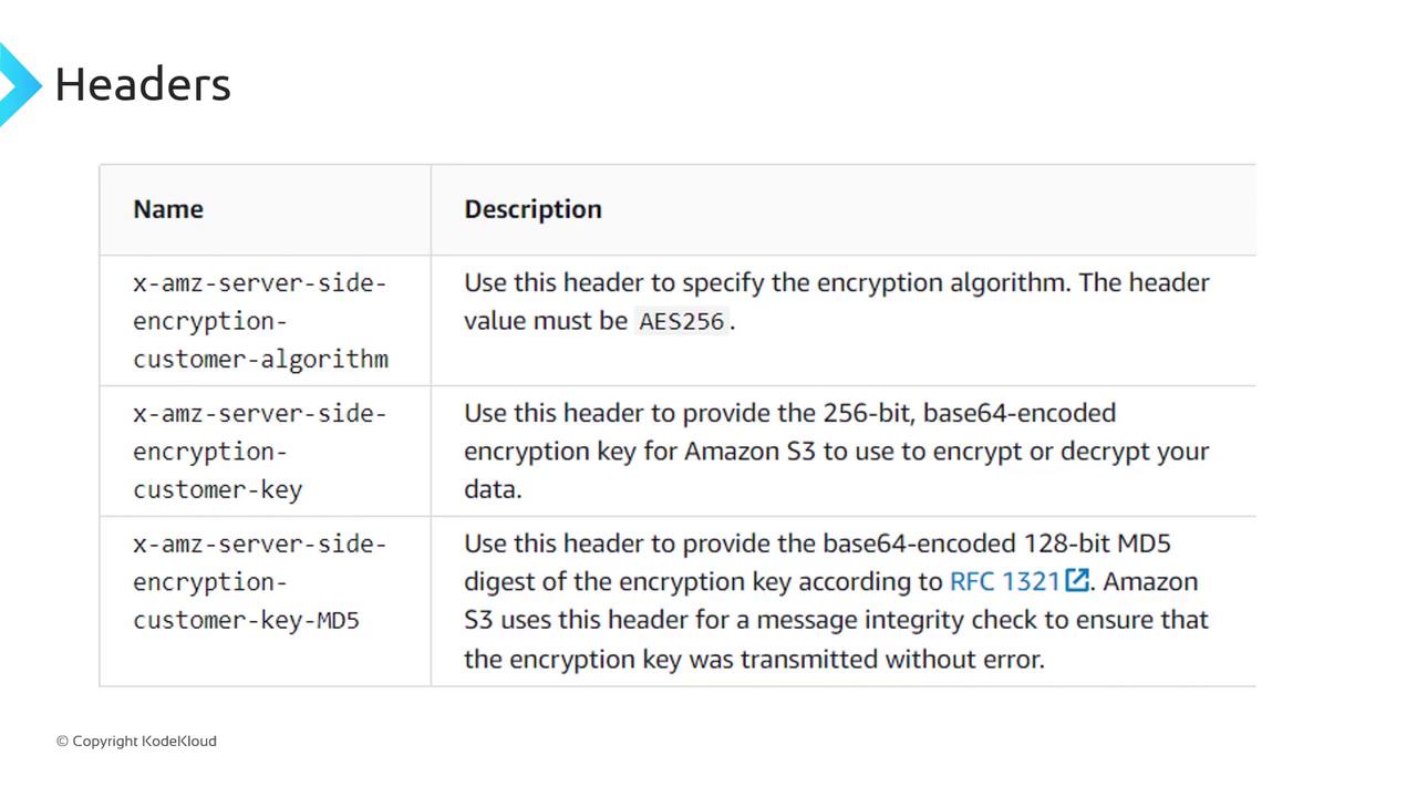 x-amz-server-side-encryption-customer-algorithm: AES256x-amz-server-side-encryption-customer-key: <Base64-encoded key>x-amz-server-side-encryption-customer-key-MD5: <Base64-encoded MD5 of key>