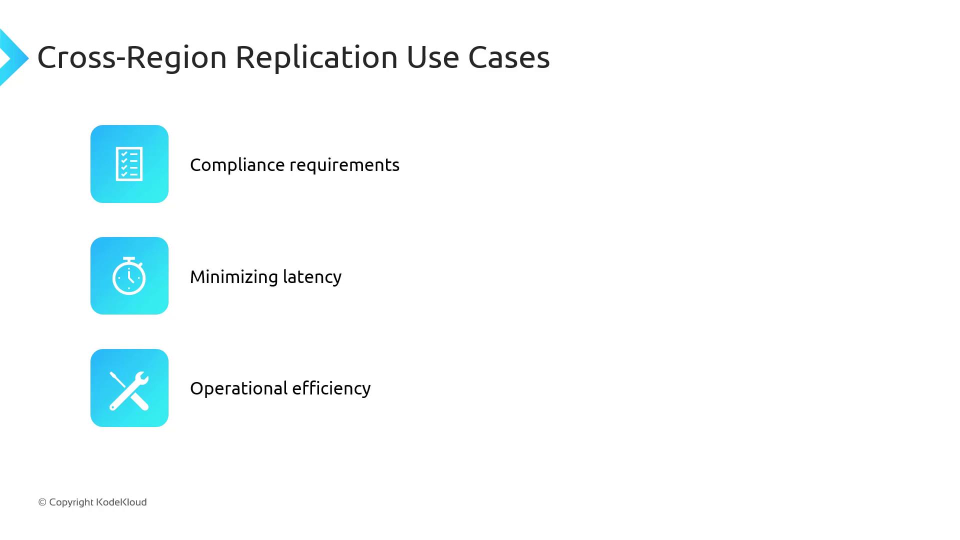 | Cross-Region Replication (CRR) | Copy objects to a bucket in a different AWS Region. |