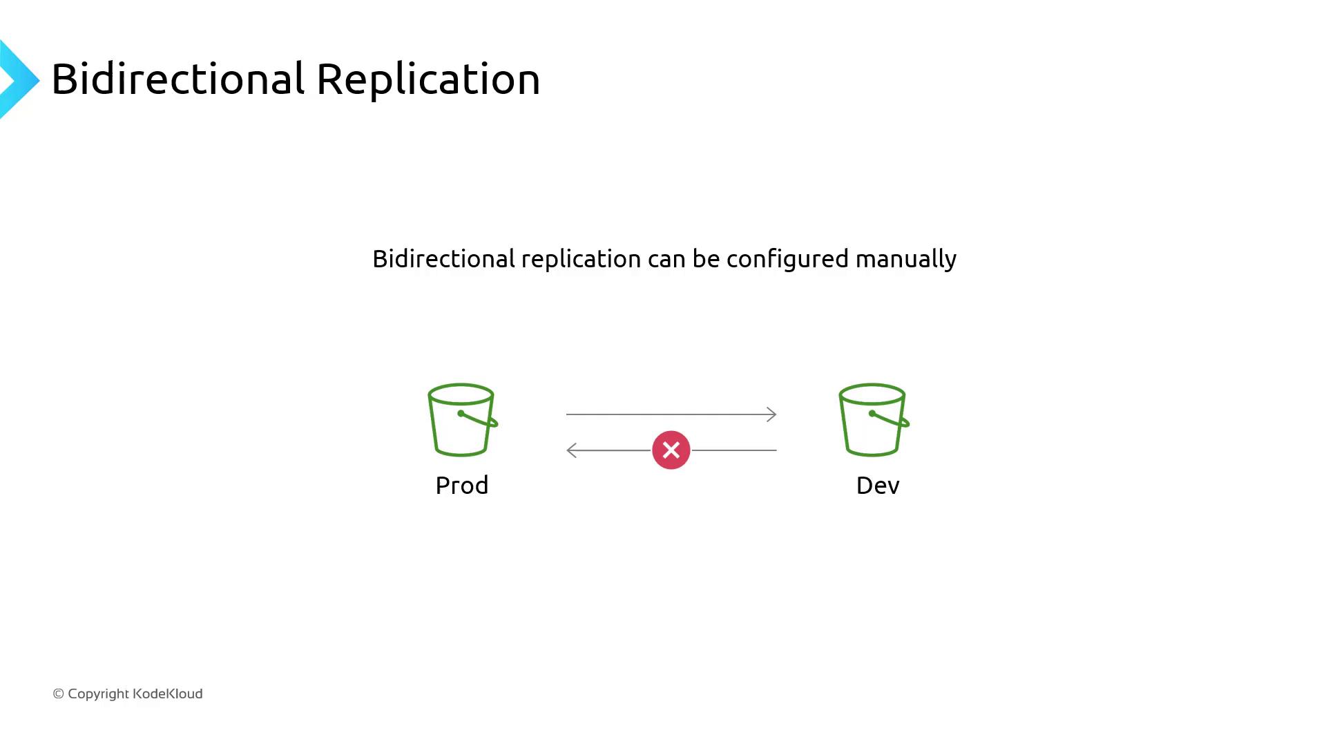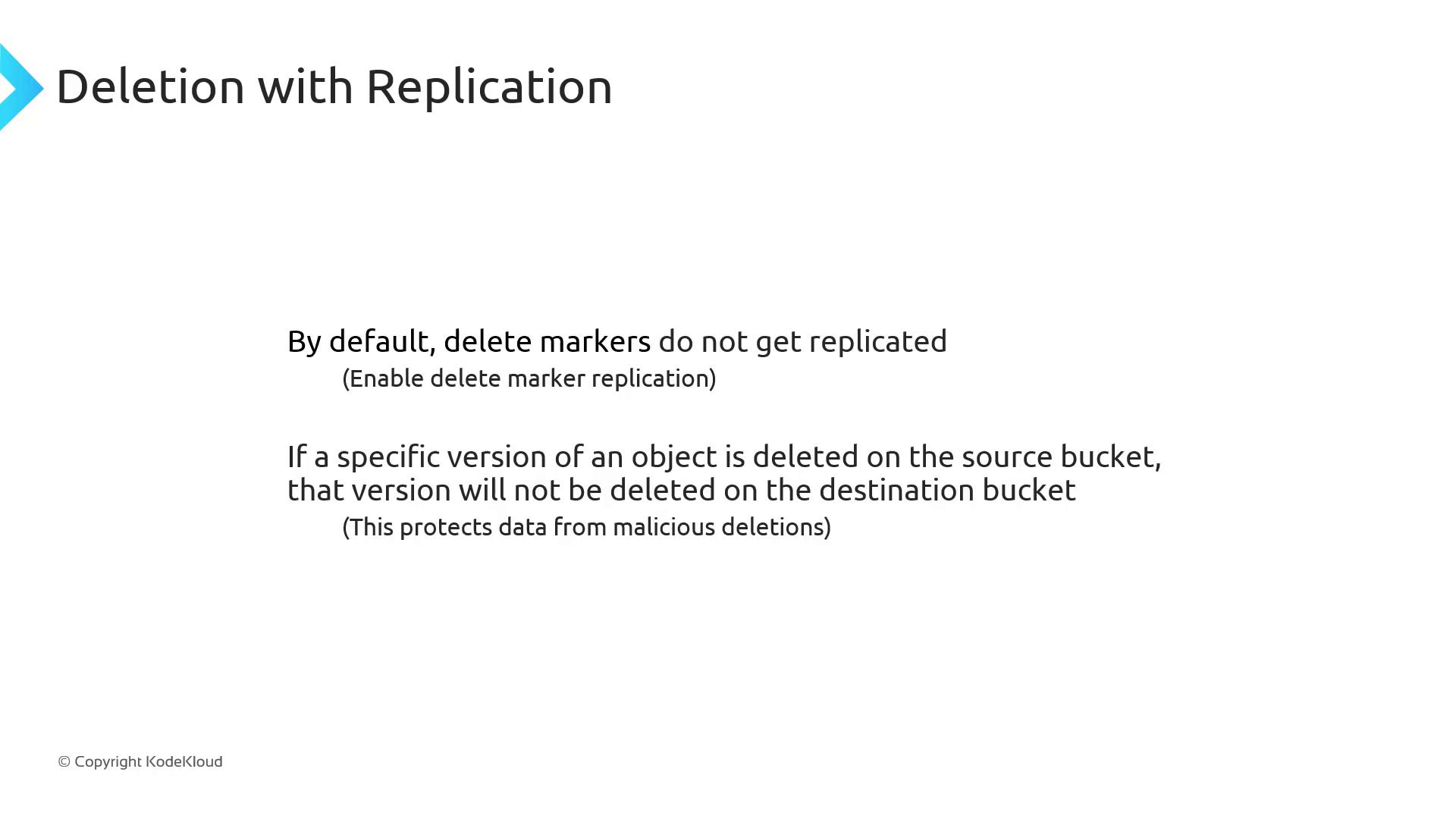 - Version Deletions: Removing a specific object version in the source bucket does not delete it in the destination—protecting against accidental or malicious data loss.