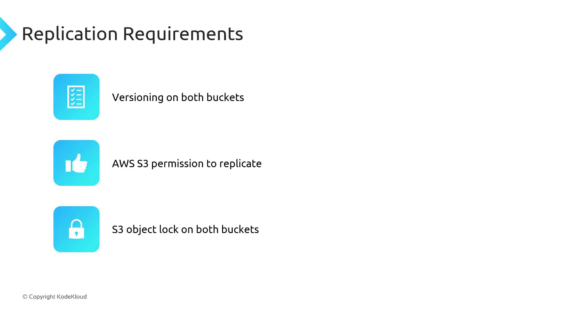 | Versioning Enabled | Turn on versioning for both the source and destination buckets. |