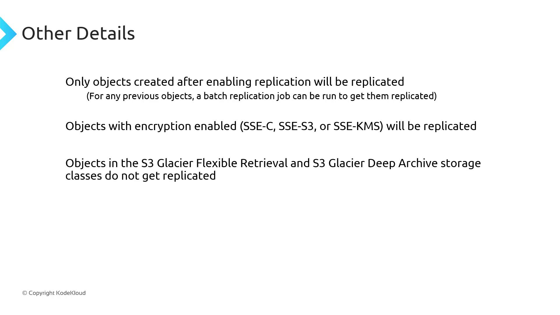 - Encryption: Objects encrypted with SSE-S3, SSE-KMS, or client-side encryption replicate transparently.