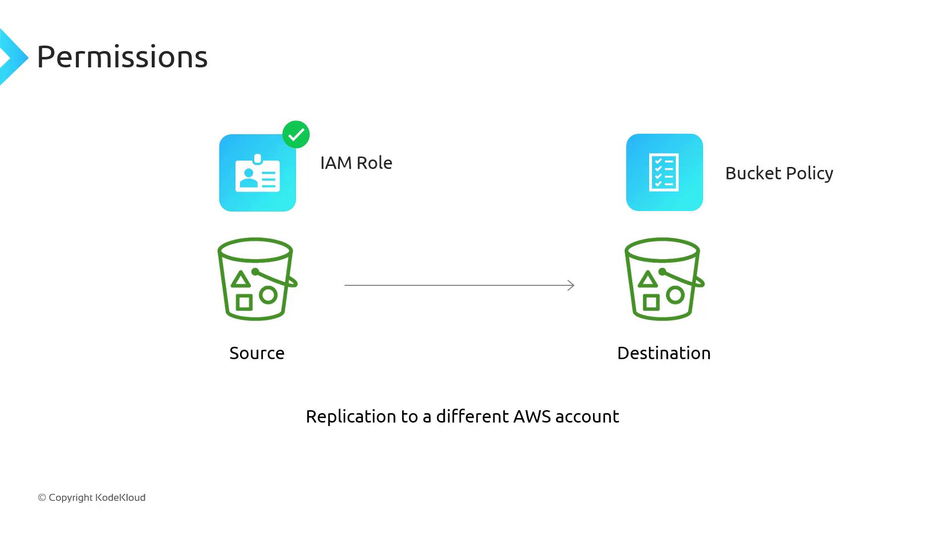 | Different AWS Accounts | In addition to the source IAM role, attach a bucket policy on the destination to allow replication. |