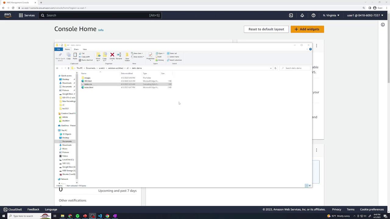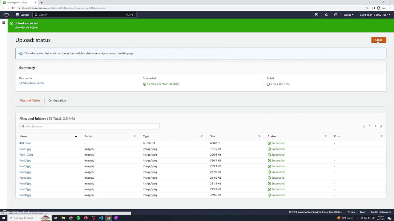 index.html,index.css,404.html, and theimages/folder into the console. - Choose Upload and confirm.