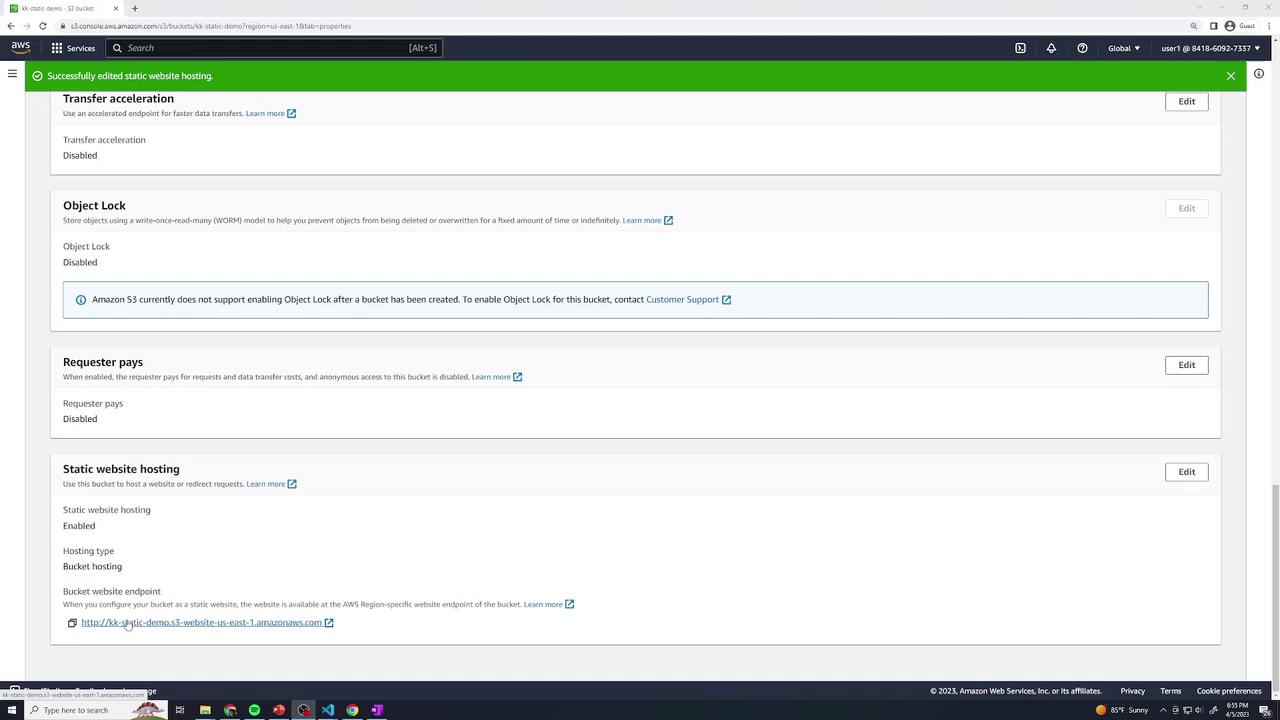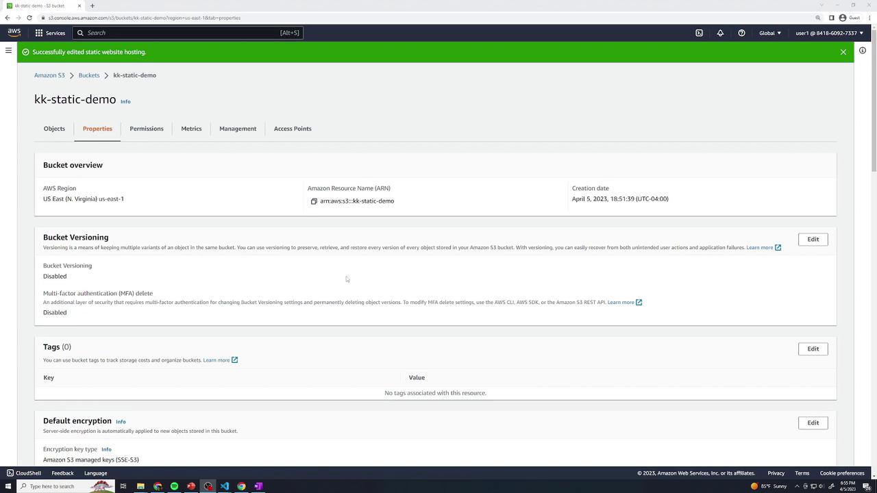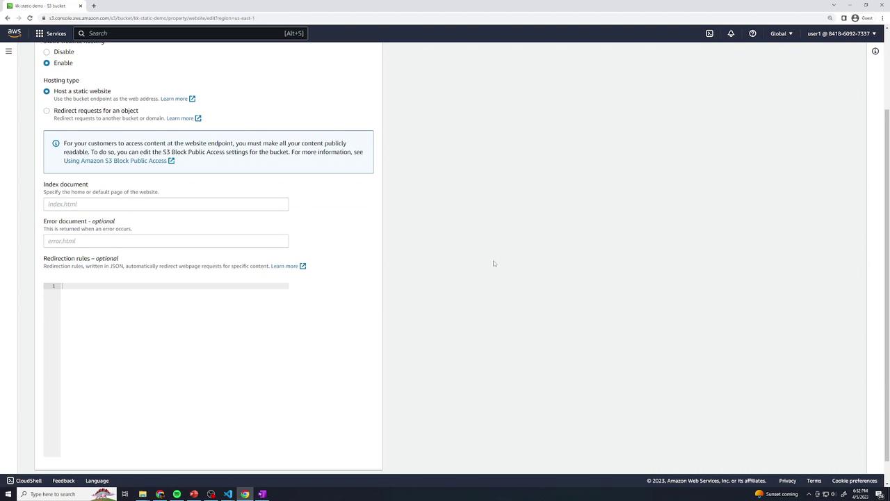 - In your bucket, navigate to Properties → Static website hosting → Edit.