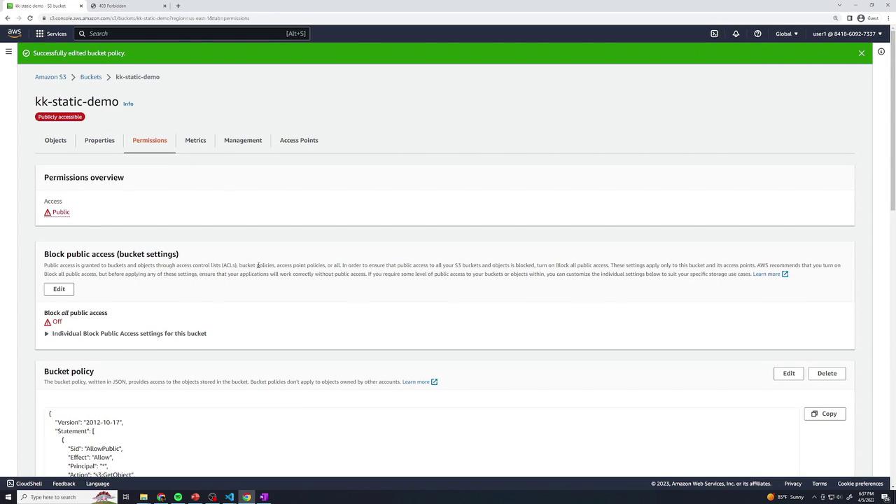 Still under Permissions, select Bucket policy and paste the following JSON (replace the ARN with your bucket name):