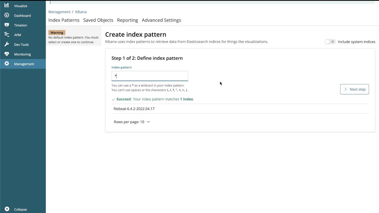 - Click "Start" or "Create" to finalize the index pattern.