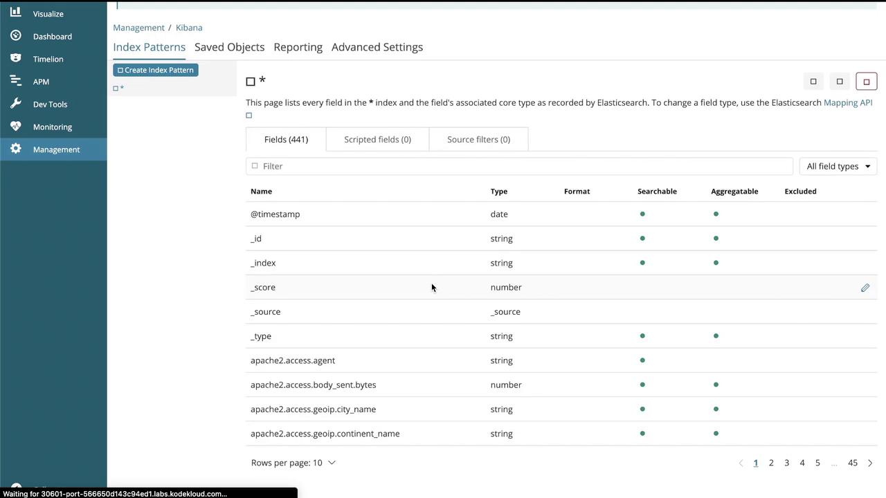 filebeat-*or as instructed in your lab). - Set the time filter field name if required.
