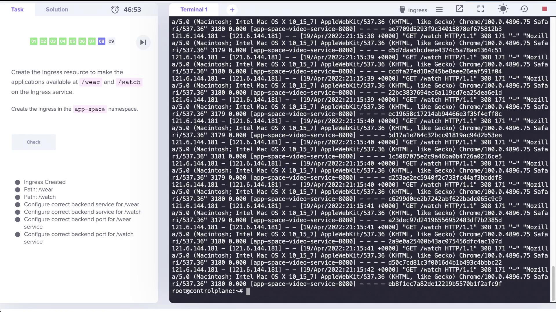 app-spacenamespace:root@controlplane:~# kubectl get pods -n app-space NAME READY STATUS RESTARTS AGE default-backend-5cf9b7d-jqcp2 1/1 Running 0 12m webapp-video-84f865bd-qpbn5 1/1 Running 0 12m webapp-wear-6ff944955-mmtqh 1/1 Running 0 12mCheck the logs of the video and wear applications to ensure new requests are reaching them: