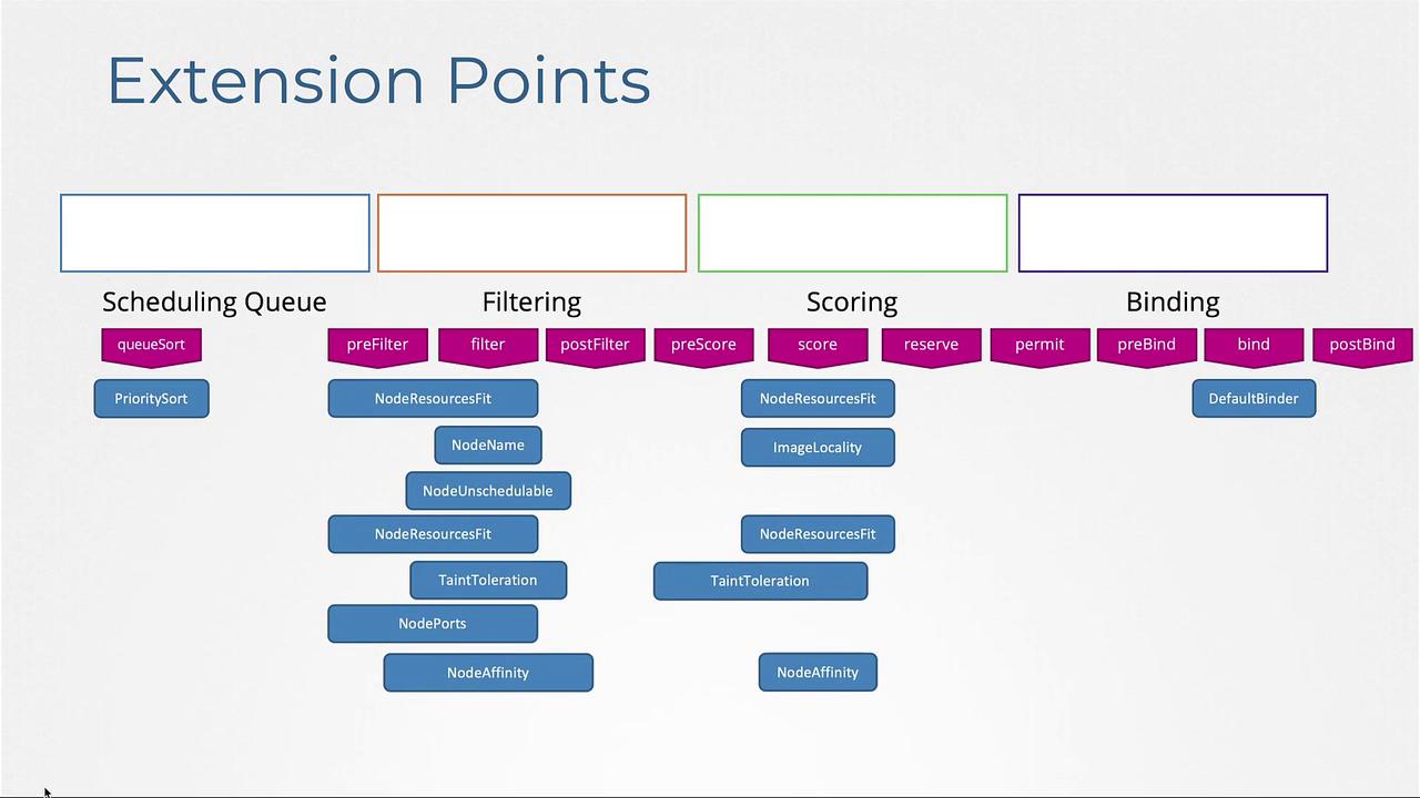 Kubernetes emphasizes extensibility, allowing you to modify the scheduling process via extension points at stages such as queueing, filtering, scoring, and binding.