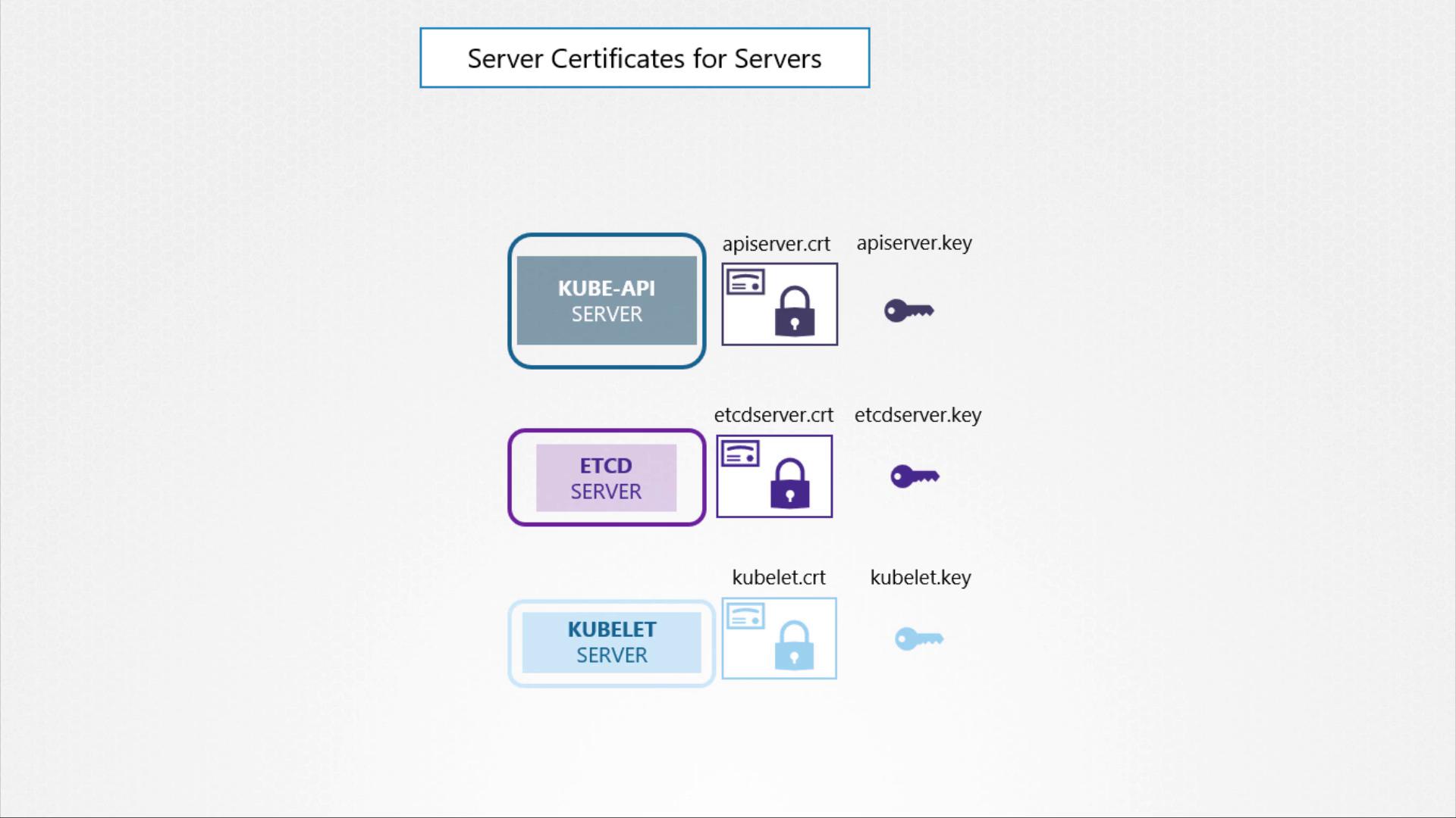 | Server Certificates | Used by server components (e.g., Kube API Server, ETCD Server, kubelet) to secure their services. |