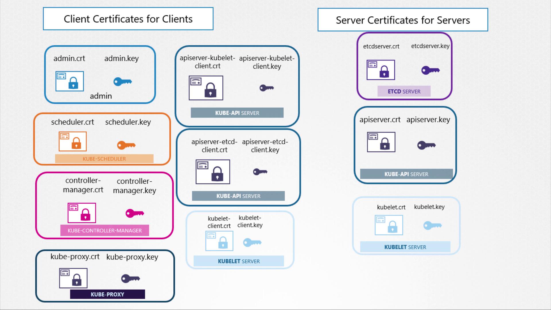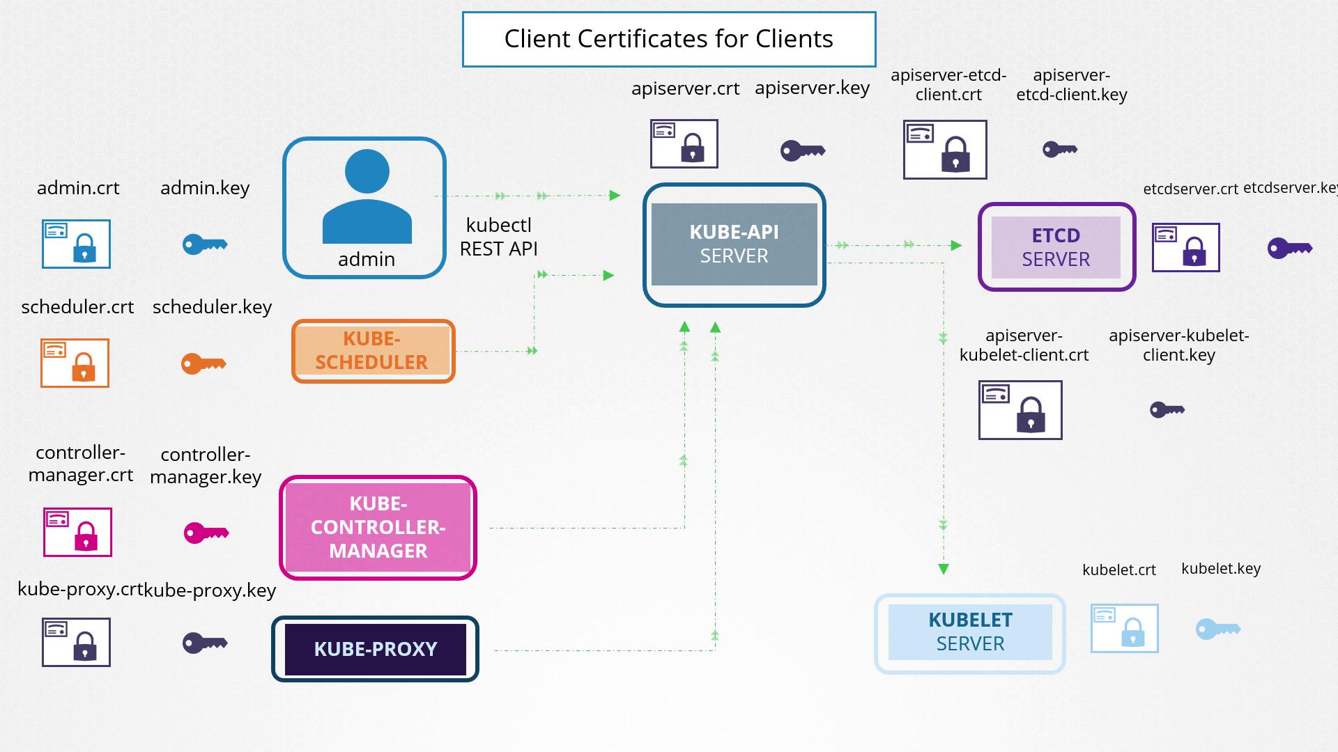 | Client Certificates | Used by components (e.g., admin, scheduler, controller manager, kube-proxy) to authenticate with the API server. |