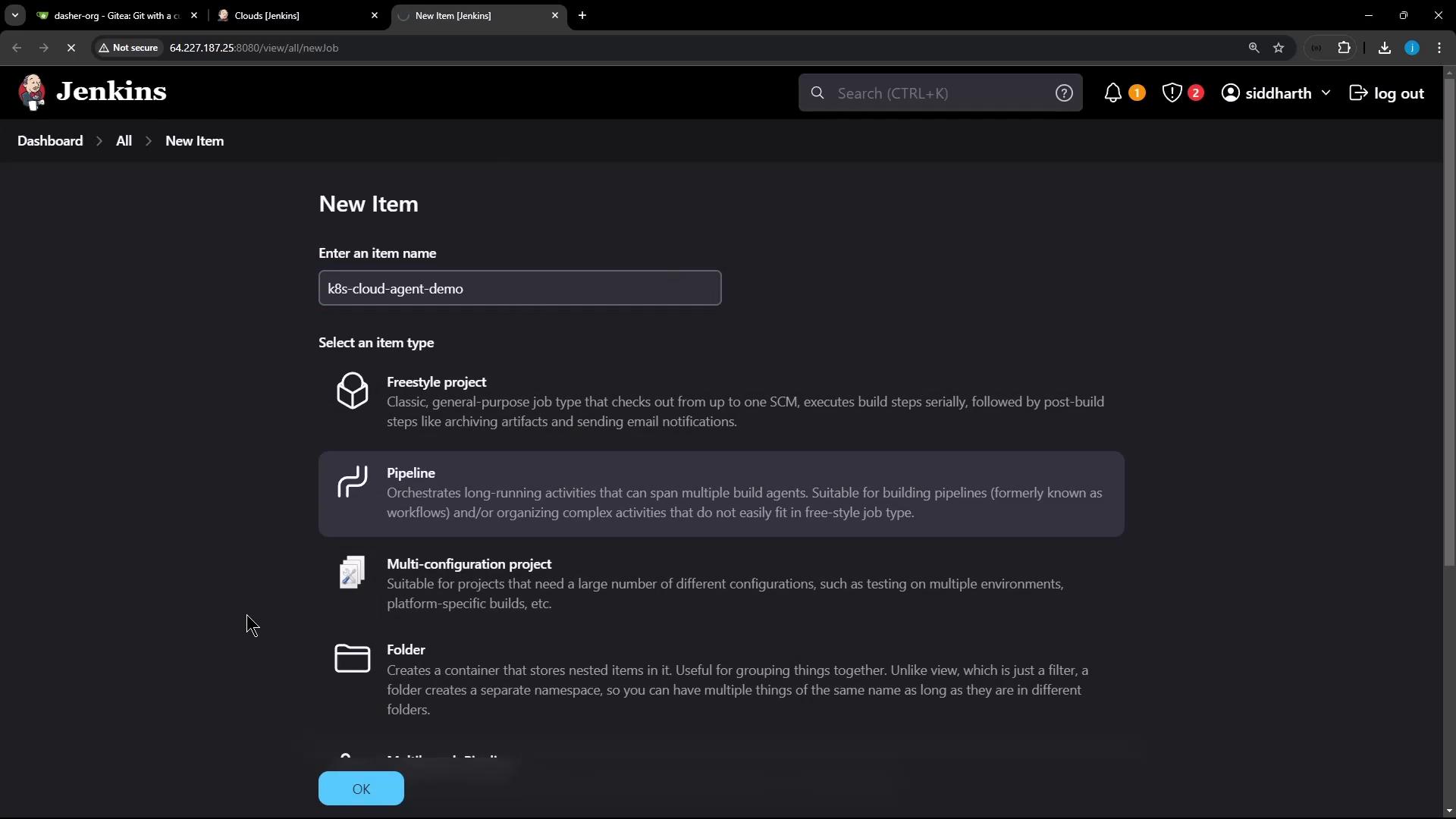 Enter the job name (k8s-cloud-agent-demo or your preferred name) and select Pipeline.