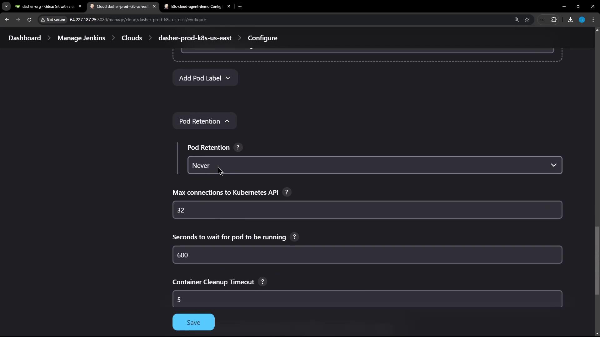 In the Kubernetes Cloud settings, Pod Retention is set to Never, so Pods are deleted after each build.