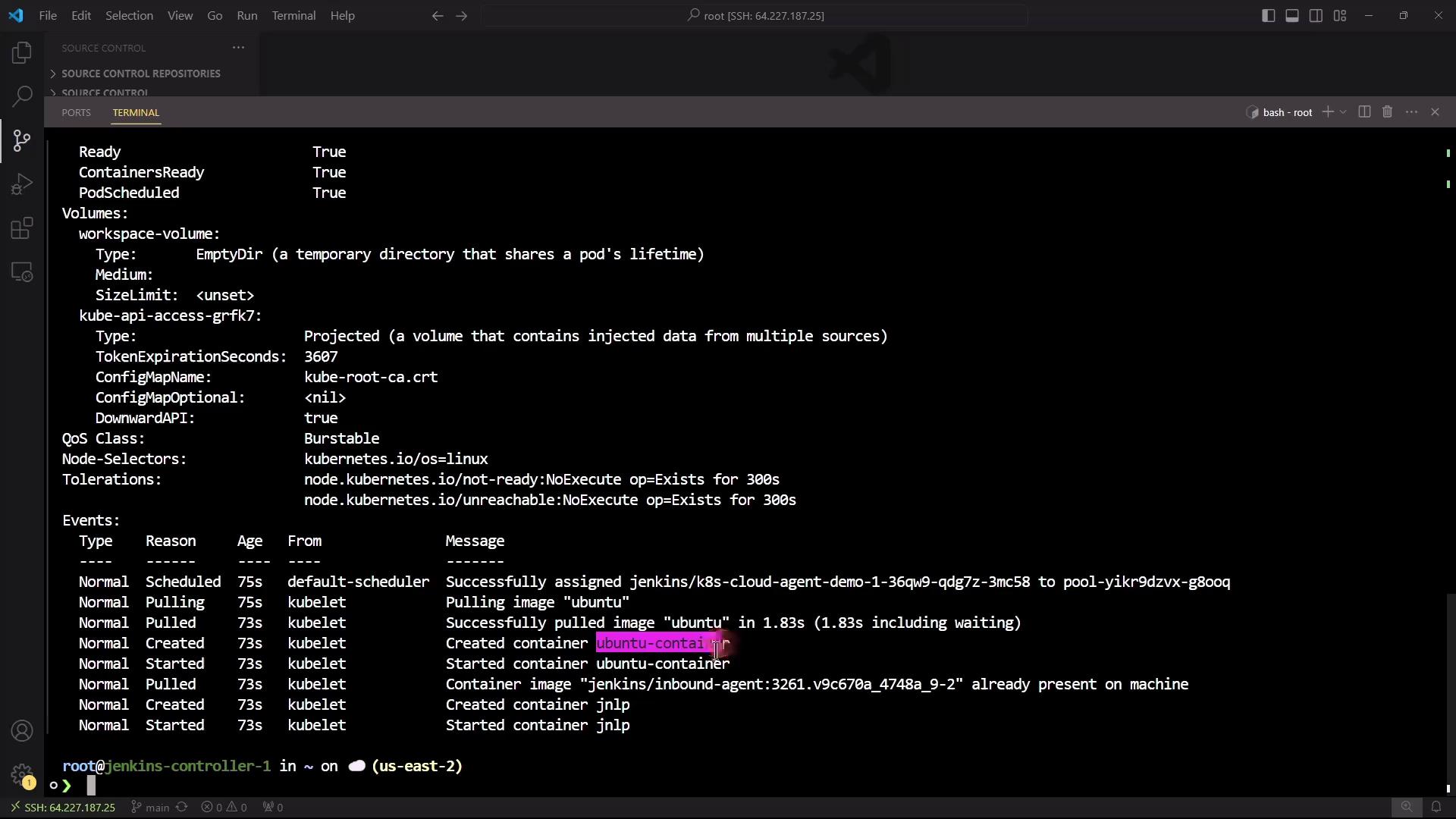 --- apiVersion: "v1" kind: "Pod" metadata: name: "k8s-cloud-agent-demo-1-36qw9-qdg7z-3mc58" namespace: "jenkins" labels: jenkins/label: "k8s-cloud-agent-1-36qw9" spec: containers: - name: ubuntu-container image: ubuntu command: ["sleep"] args: ["infinity"]On your Kubernetes cluster, verify the Pod: