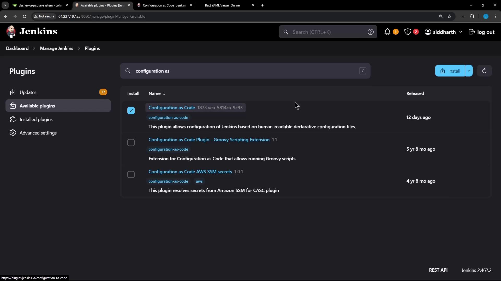 - Search for Configuration as Code, select it, and click Install (restart if prompted).