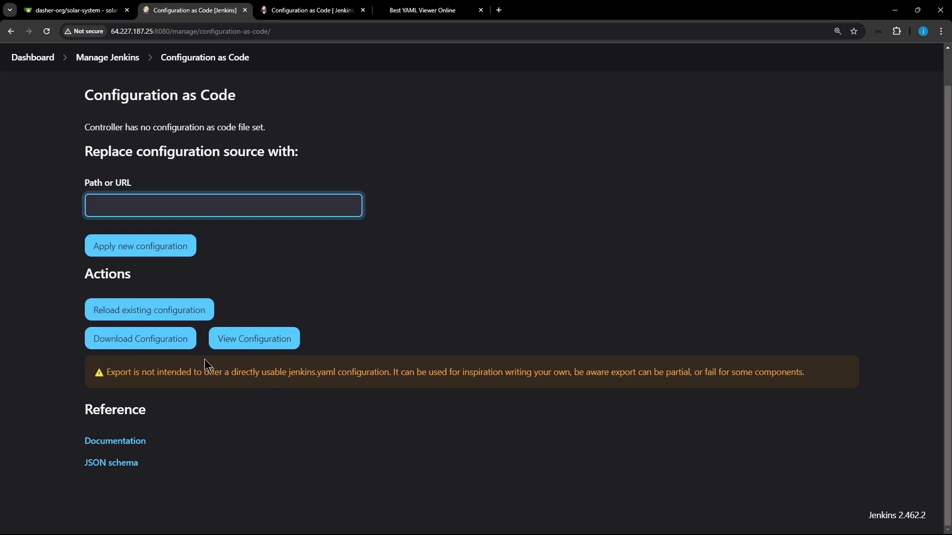 Then, on Manage Jenkins → Configuration as Code, use Replace Configuration to point to: