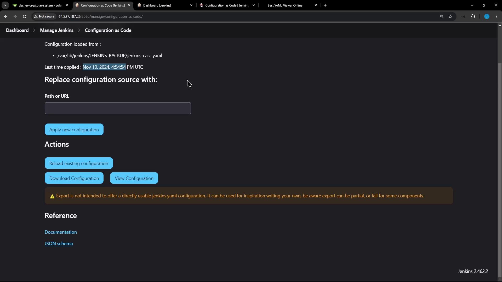 Navigate to Manage Jenkins → Configuration as Code. Here you can:
