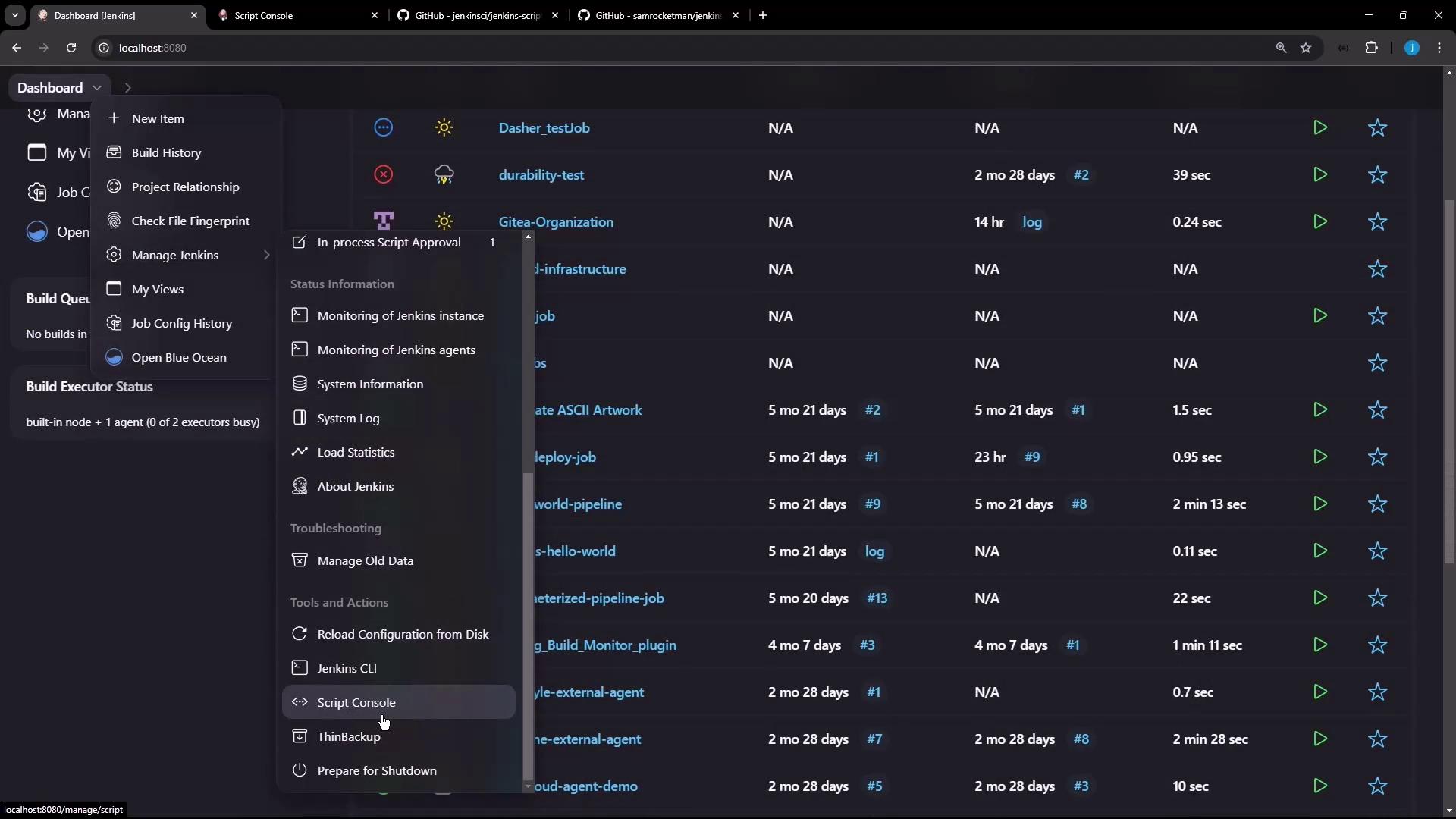 The Jenkins Script Console enables administrators to execute Groovy scripts directly on the controller or any connected agent. This powerful interface is ideal for debugging, configuration, and maintenance tasks.