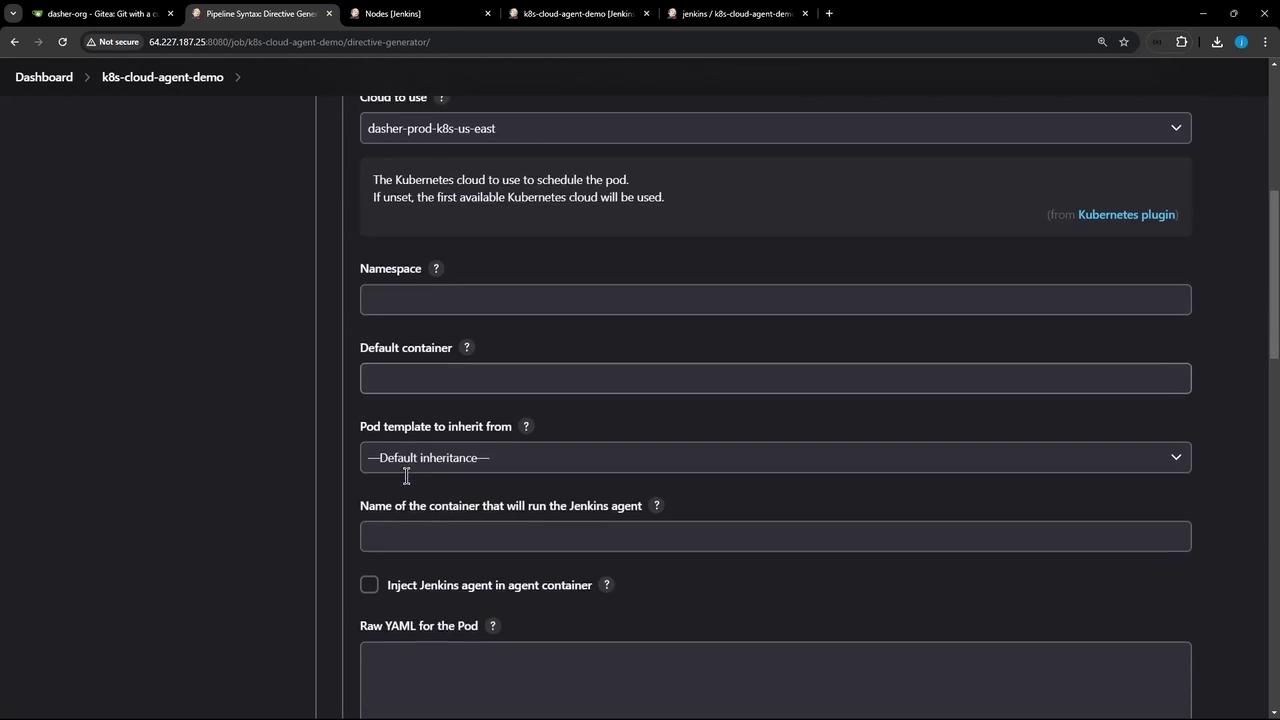 Ensure the Kubernetes plugin is installed in Jenkins and your Kubernetes cloud configuration (dasher-prod-k8s-us-east) is active before running the refactored pipeline.
