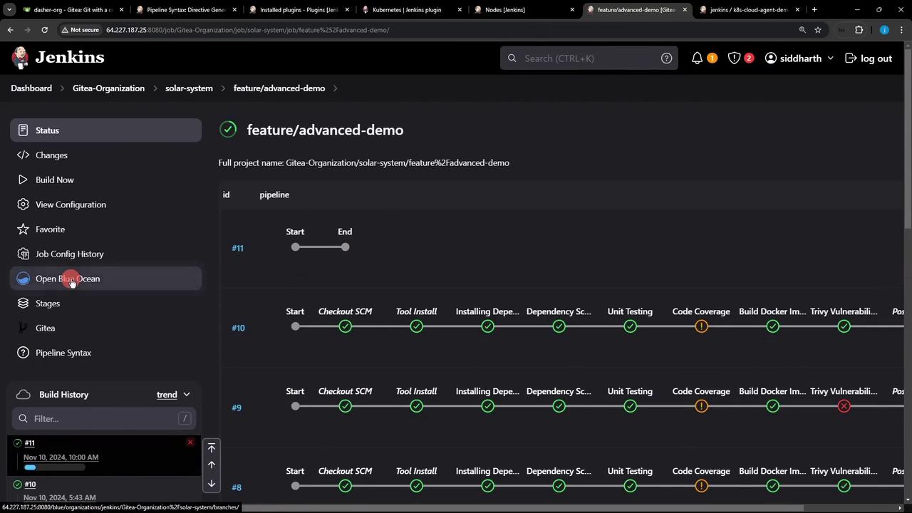 Commit your changes and push to trigger the pipeline. You can monitor status and logs in Blue Ocean: