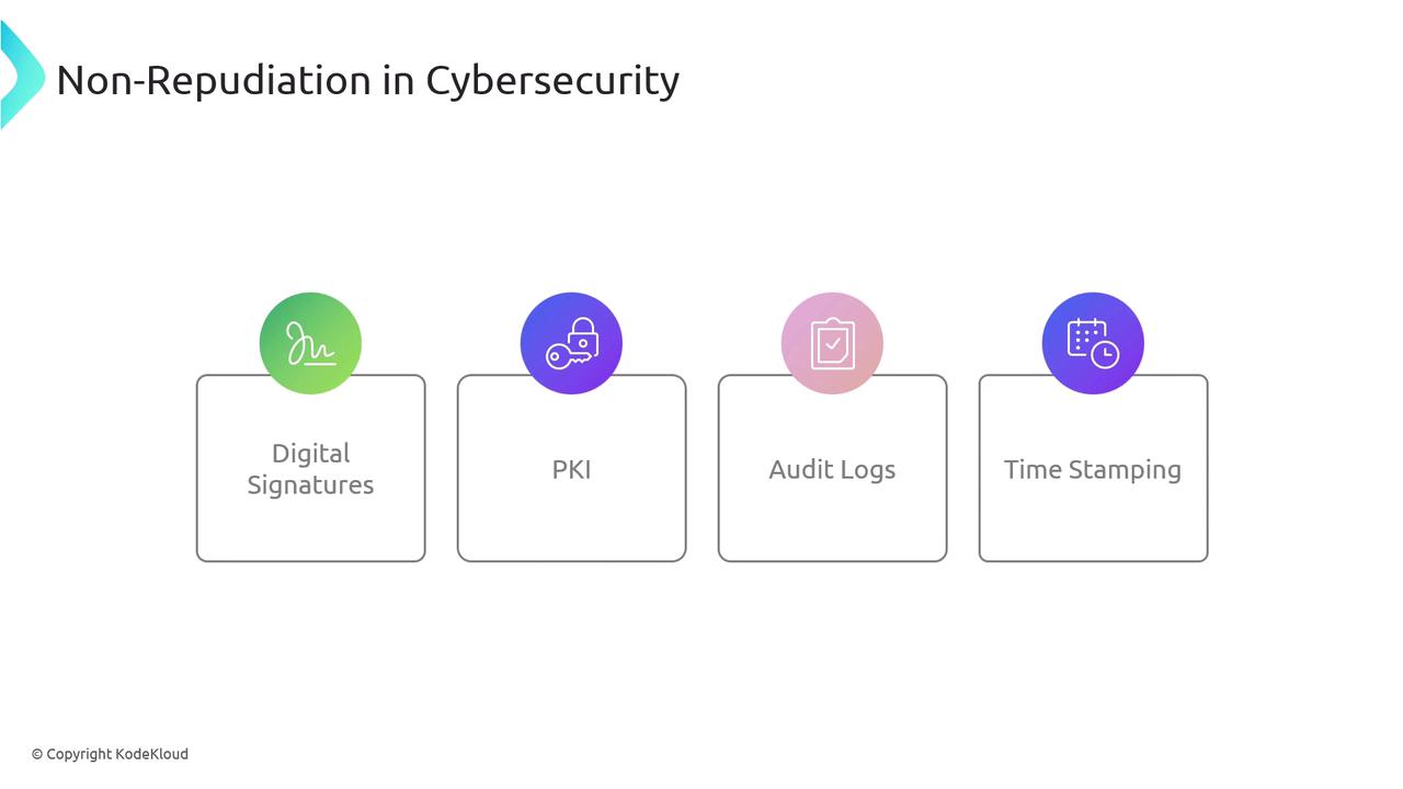 For instance, if an individual sends an email or initiates a transaction, non-repudiation ensures they cannot later claim non-involvement. Techniques such as digital signatures, Public Key Infrastructure (PKI), audit logs, and timestamping establish a verifiable record of a message's origin and its integrity.