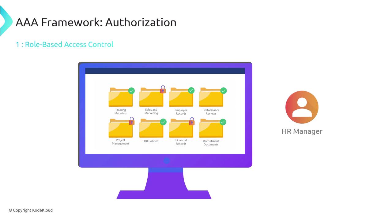 - Role-Based Access Control (RBAC): Grants permissions based on assigned roles (e.g., employee, manager, administrator).