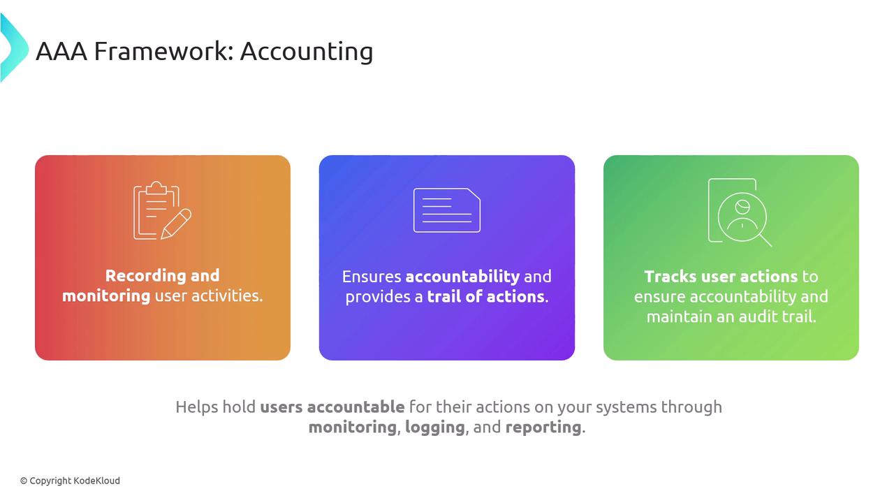 The final component, Accounting, is focused on logging and monitoring user activities and resource usage. Also known as Auditing, this process establishes records that reinforce non-repudiation and support forensic analysis, system auditing, and accountability. Detailed audit trails play a crucial role in detecting security breaches and ensuring that actions can be traced back to the responsible party.