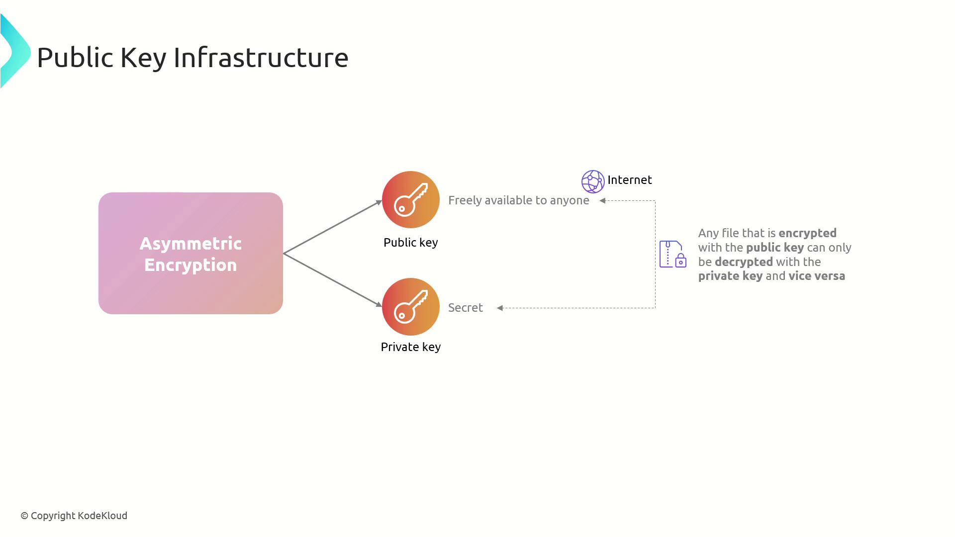 PKI also enables secure file transmission. When you make your public key available, anyone can encrypt a file for you. Only you can decrypt it with your private key, ensuring secure communication.