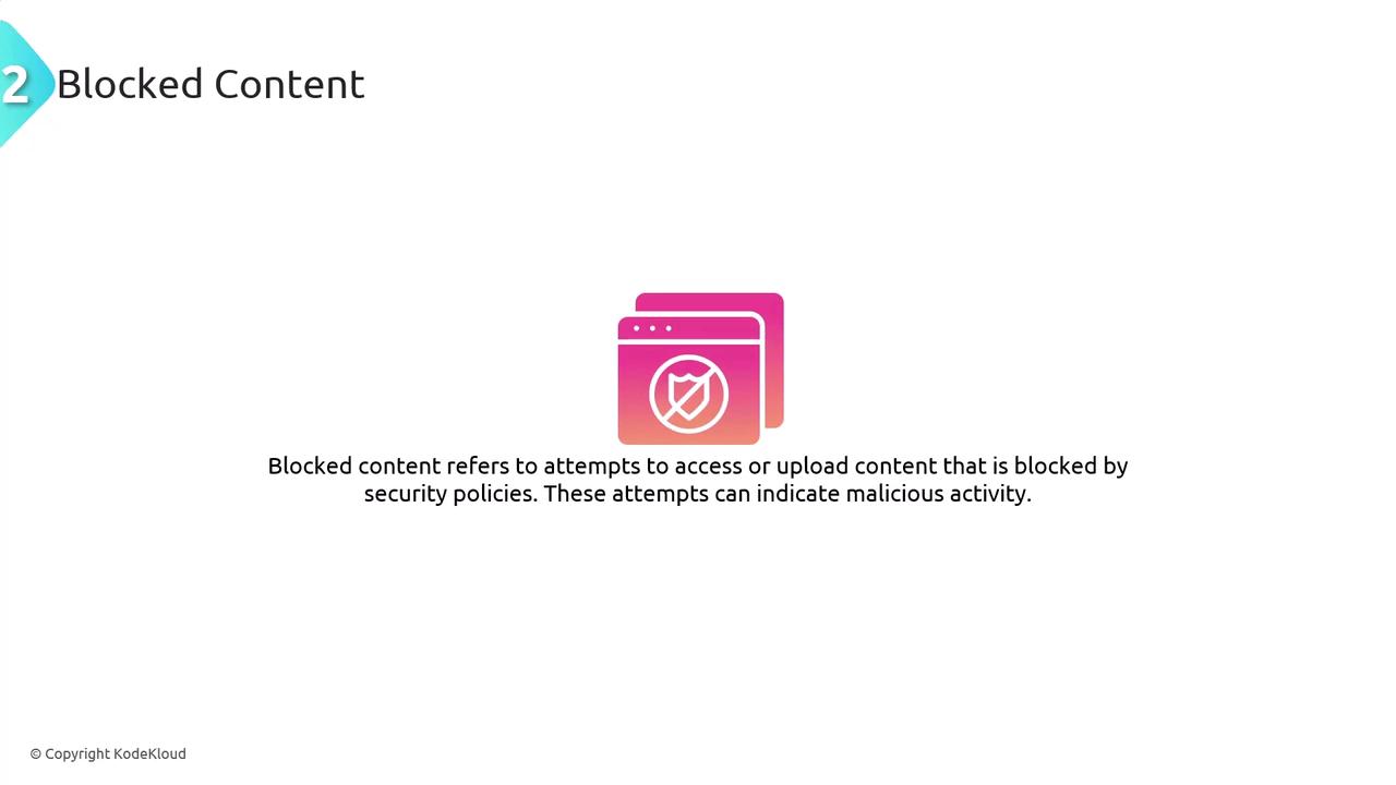 Blocked content refers to attempts to access or upload data that violates security policies. Such actions indicate potential attempts to bypass security controls. Any attempt to transmit or retrieve restricted content should immediately trigger an alert, as this behavior may be linked to malicious intent.