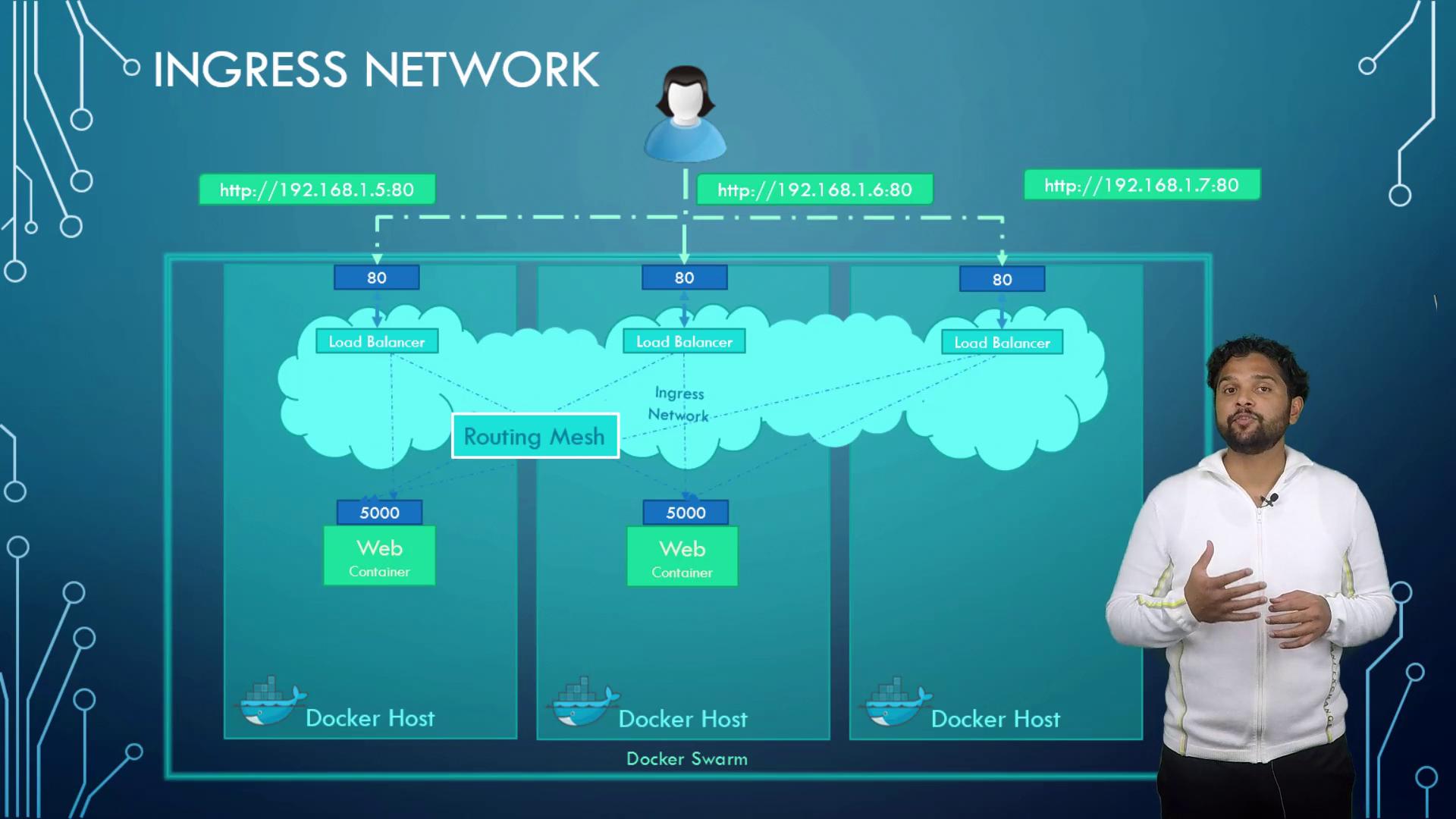 The ingress network ensures that ports are adequately published on all nodes and that traffic is properly balanced among service instances.