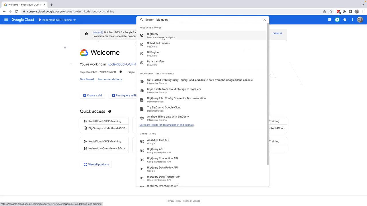 Log in to your GCP Console, select the appropriate project, and use the search bar to find "BigQuery". You will see options under Data Warehouse and Analytics.