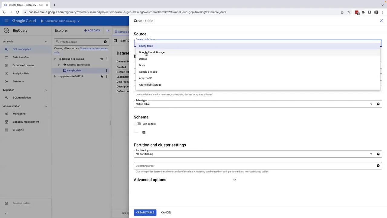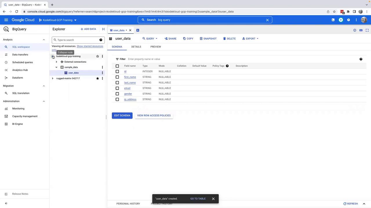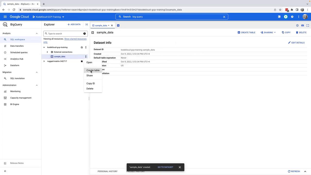 Choose your dataset (in this example, "sample_data") and specify a table name (for example, "user_data").
