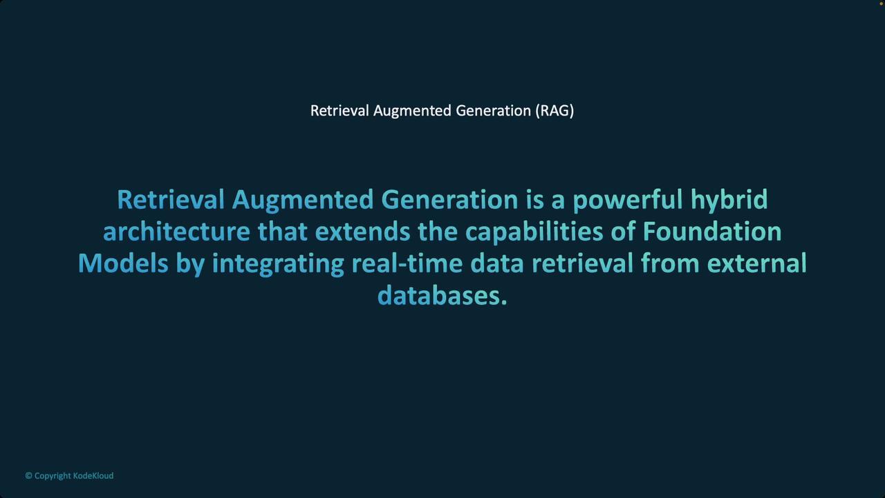 In this lesson, we explore Retrieval Augmented Generation (RAG) as an innovative solution to one of the most significant limitations of foundation models: the lack of dynamic context. Foundation models are essentially “frozen in time” because they rely on static, pre-trained knowledge. While fine-tuning can partially address this issue, it is often impractical due to cost and feasibility constraints. Understanding RAG is essential, as this approach is rapidly emerging as a core pattern in building production systems that require real-time data access.