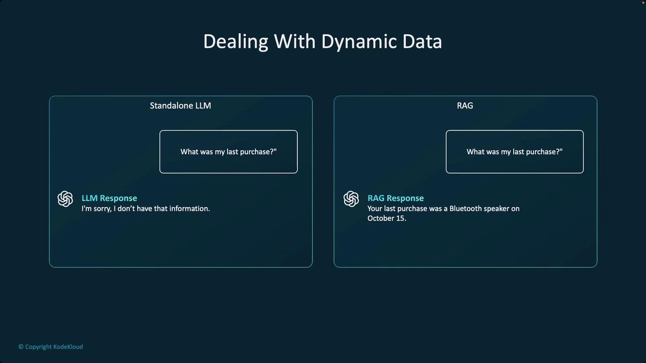A primary motivation for RAG is overcoming the outdated knowledge inherent in standalone foundation models. Consider a query like "What was my last purchase?" A vanilla foundation model would struggle to provide an accurate answer because it doesn't have access to the latest transaction data. By integrating up-to-date datasets, RAG systems enable dynamic and grounded responses. The following illustration demonstrates how a standalone LLM and a RAG system handle this query differently: