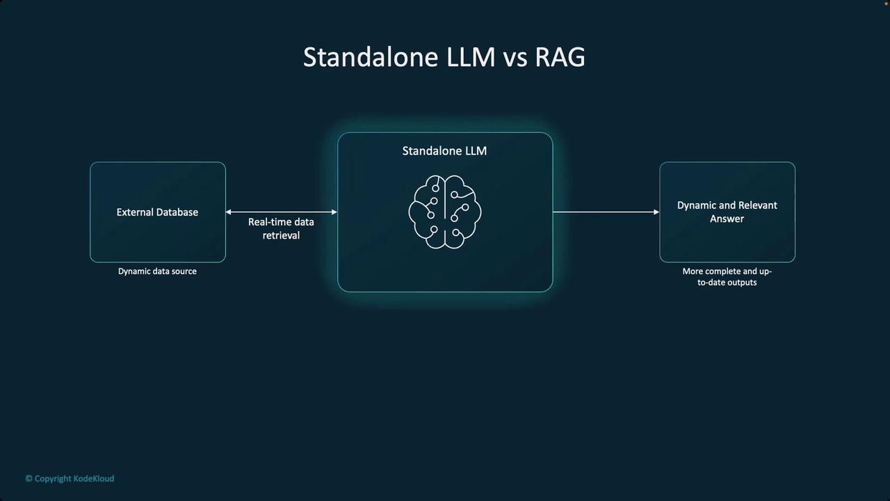 The following diagram compares a standalone language model with a RAG system, highlighting how dynamic data retrieval enhances response quality: