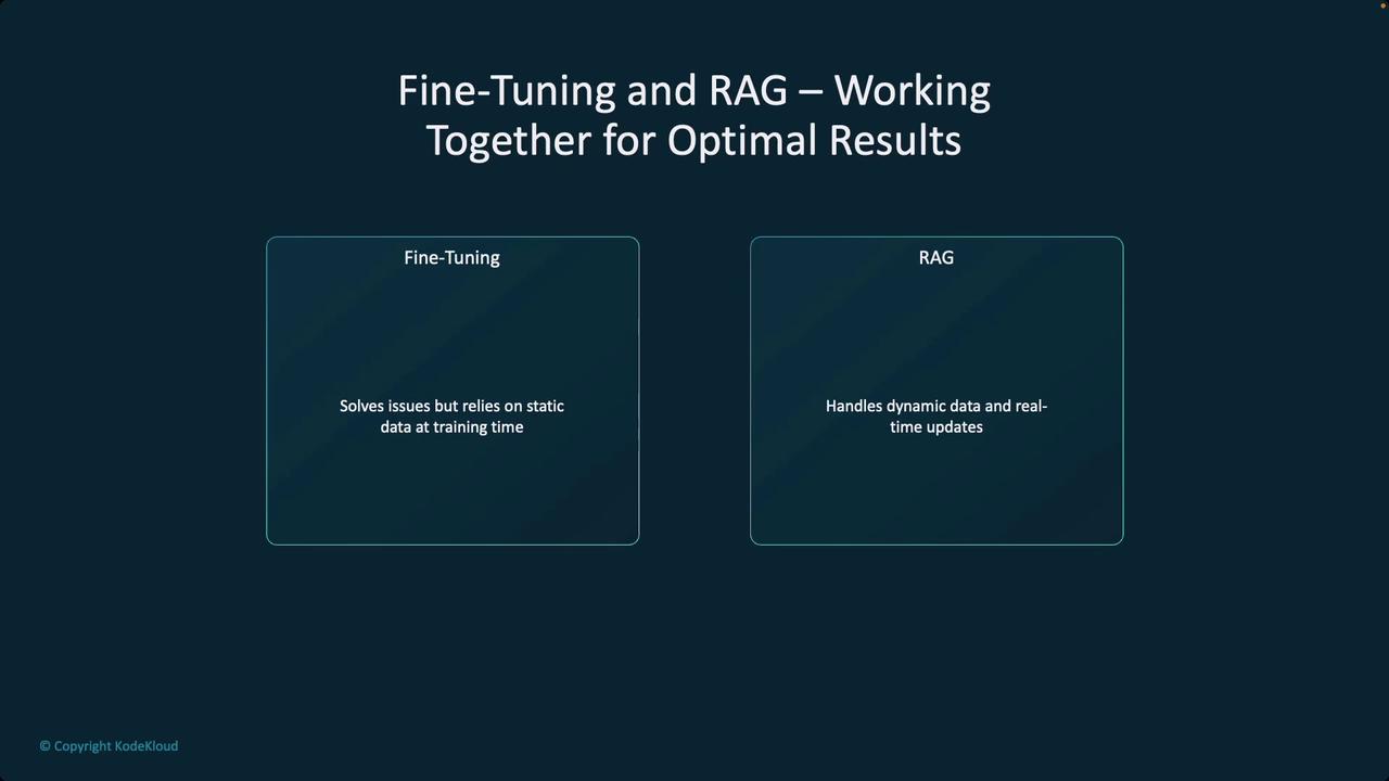 In production environments, it is uncommon to rely solely on fine-tuning or on a standalone retrieval system. Instead, most systems combine both techniques. A well-designed setup might leverage the broad context window of a foundation model while dynamically retrieving data to ensure outputs are both accurate and relevant. Even sophisticated models benefit from integrating retrieval mechanisms to maintain grounded and timely information.