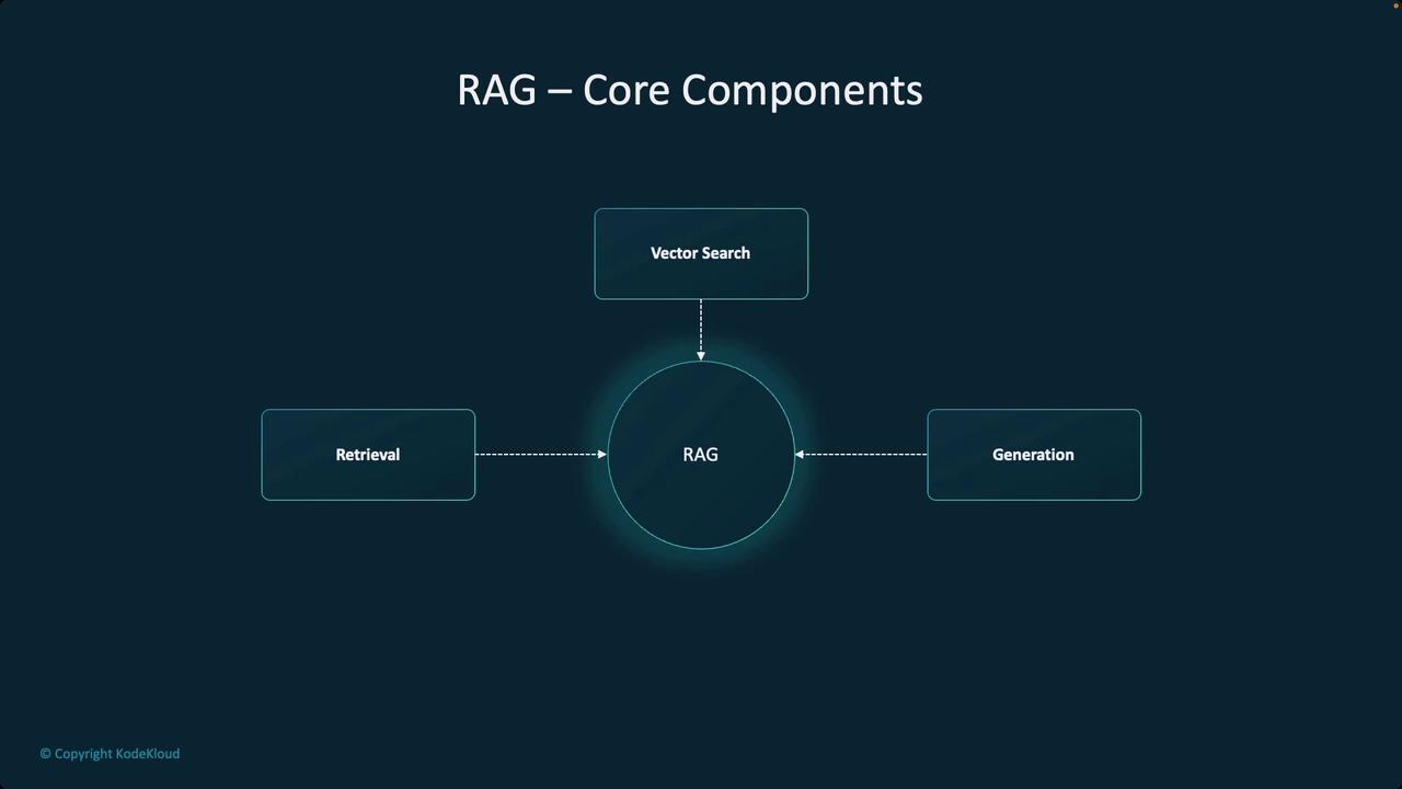 The core components of a RAG system are retrieval and generation, with vector search playing an essential role. Vector search allows the model to semantically match queries with the most relevant data, ensuring the retrieval process is both efficient and effective. The diagram below summarizes these core components: