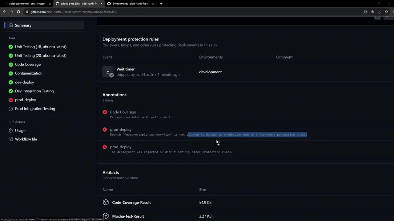 If prod-deploy is blocked by branch protection or environment rules, you’ll see an error and the integration test will be skipped.