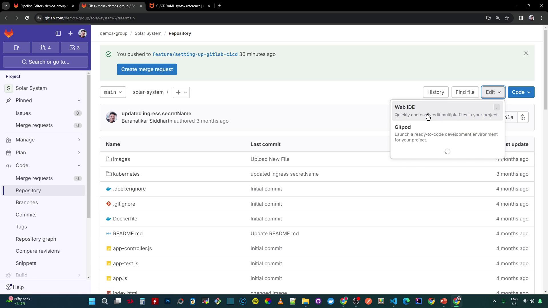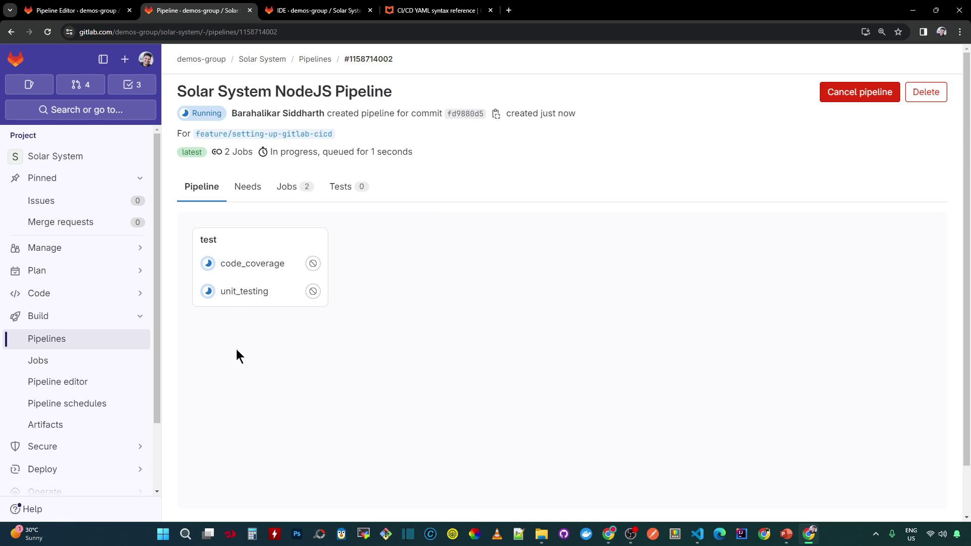 workflow: name: Solar System NodeJS Pipeline rules: - if: '$CI_COMMIT_BRANCH == "main" || $CI_COMMIT_BRANCH =~ /^feature/' when: always - if: '$CI_MERGE_REQUEST_SOURCE_BRANCH_NAME =~ /^feature/ && $CI_PIPELINE_SOURCE == "merge_request_event"' when: alwaysCheck the MR sidebar for: