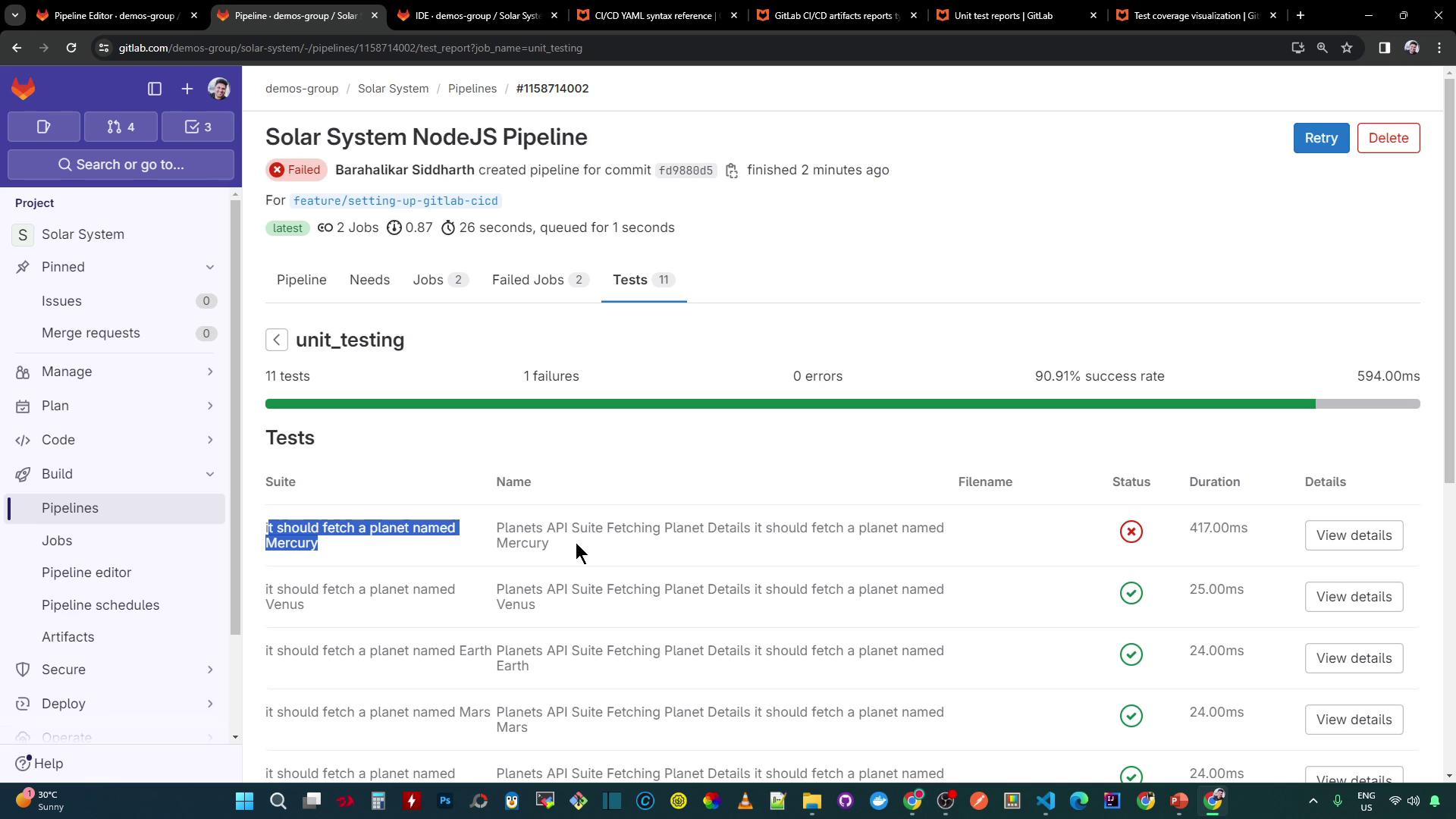 After the pipeline runs, review the job log for failures and coverage warnings: