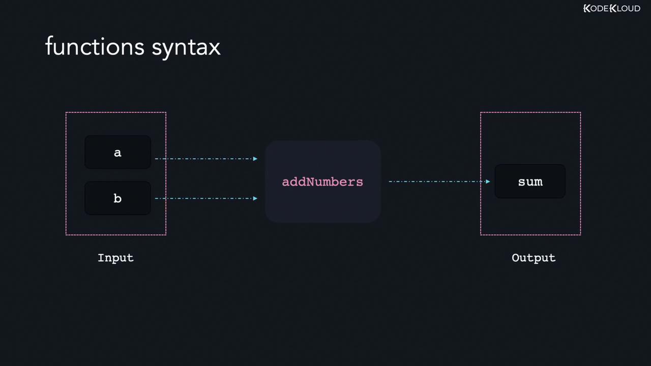 Our discussion then progressed to functions, where we learned how to create reusable blocks of code. The diagram below illustrates a typical function where inputs "a" and "b" are processed by the function "addNumbers" to produce the output "sum".