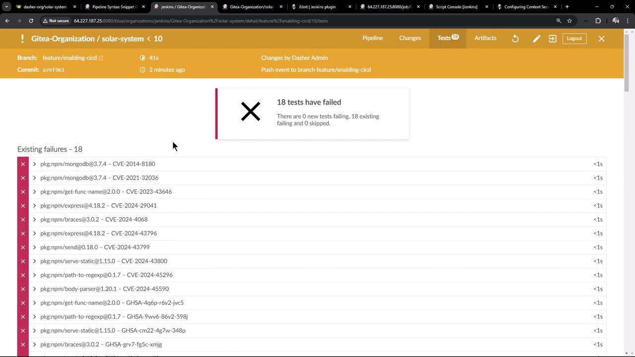 The screenshot below shows a Jenkins test results page listing several failures with details related to npm packages and CVE identifiers: