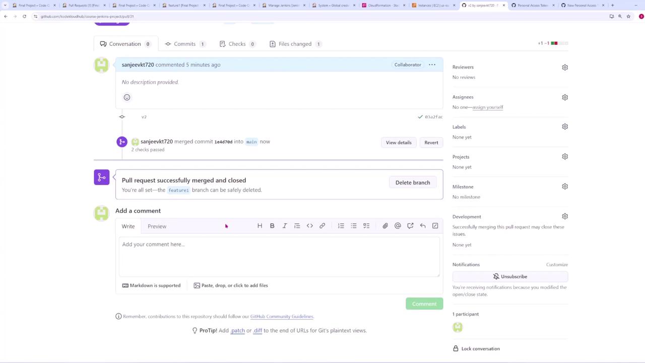 When the new feature branch is ready, create a pull request from the feature branch to the main branch. The Jenkins multibranch pipeline will then detect the pull request and build it accordingly.